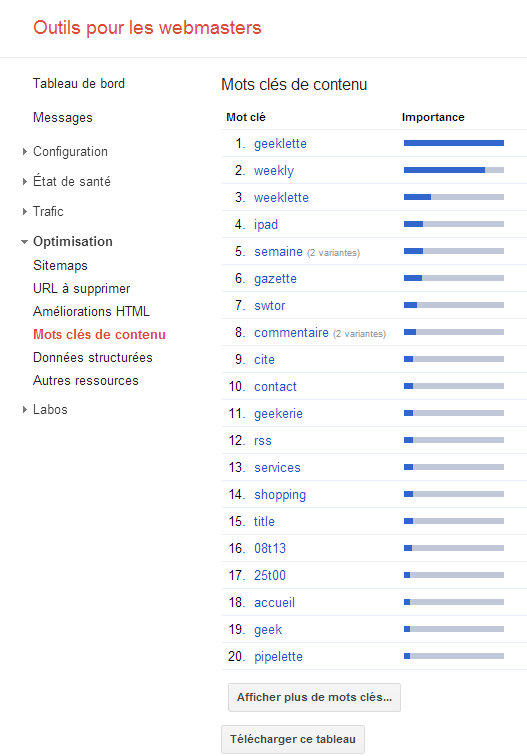 - EDIT (30/01/2013) Je pense avoir trouvé d’où cela provient : le thème + un plugin s’occupe des meta keywords : 2 pb : le thème répète à chaque article les mêmes mots clé (d’où le duplicate content) et en plus j’ai deux fois la balise méta dans mon code… bravo wordpress. j’ai désactivé tout ça et mes keywords deviennent juste mes titres; c’est suffisant. On va voir comment réagi Google 🙂