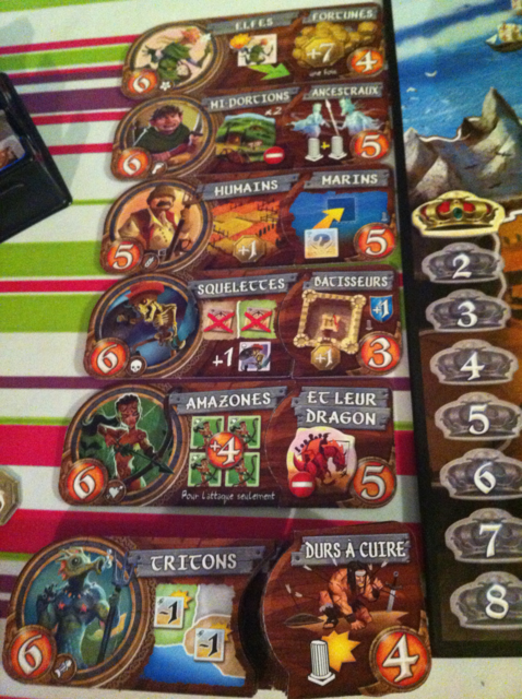 Je vous explique en gros, c’est un jeu de conquête mais aussi de placement. Vous choisissez un peuple muni d’un pouvoir parmi 6 compositions (si vous prenez pas le premier, vous payez autant de points que ceux que ne vous prenez pas). Vous prenez ensuite les tuiles correspondant à ce peuple, et vous les déployez sur le plateau. Soit vous attaquez, soit le territoire vide est conquis avec 2 tuiles. Jusque là tout va bien mais arrive un moment où le plateau est trop petit, il va bien falloir attaquer les voisins joués par l’adversaire (ou les adversaires). C’est là que ça devient intéressant évidemment. En dix tours, vous aurez donc à gagner le plus de points de victoires. L’avantage c’est qu’une fois qu’un peuple est bien utilisé et bien déployé, on peut le mettre en déclin et en choisir un autre. Les points des territoires conquis par le peuple en déclin sont toujours valables. Un joueur ne peut avoir qu’un peuple en déclin (ça parait fortement logique quand on y joue).