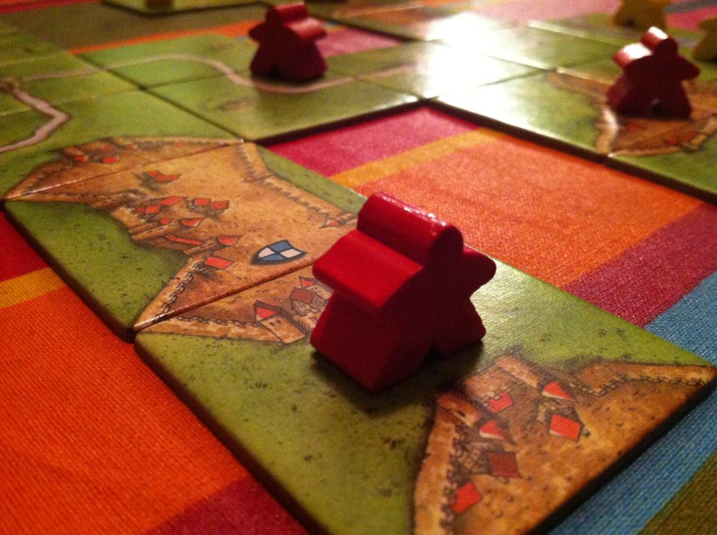 Chaque joueur pioche une tuile qu’il doit placer face visible sur la table dans le prolongement de la ou les tuiles déjà présentes. Il choisit ensuite de placer un de ces meeples sur le chemin, le pré, la ville ou l’abbaye suivant la tuile. Le but est d’étendre le plus possible le territoire de vos meeples. Simple à expliquer, pas si simple à jouer quand même car on ne dispose que de 7 meeples et le nombre de tuiles est évidemment beaucoup plus élevé. Les meeples ne peuvent être récupérés que si leur territoire ne peut plus être étendu. Par exemple, une tuile qui ferme une route permet au joueur ayant posé son meeple sur cette même route de le récupérer et de compter ses points gagnés. Le meeple récupéré pourra ainsi être reposé sur une tuile jouée.