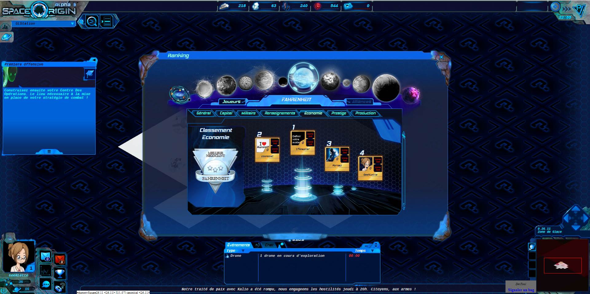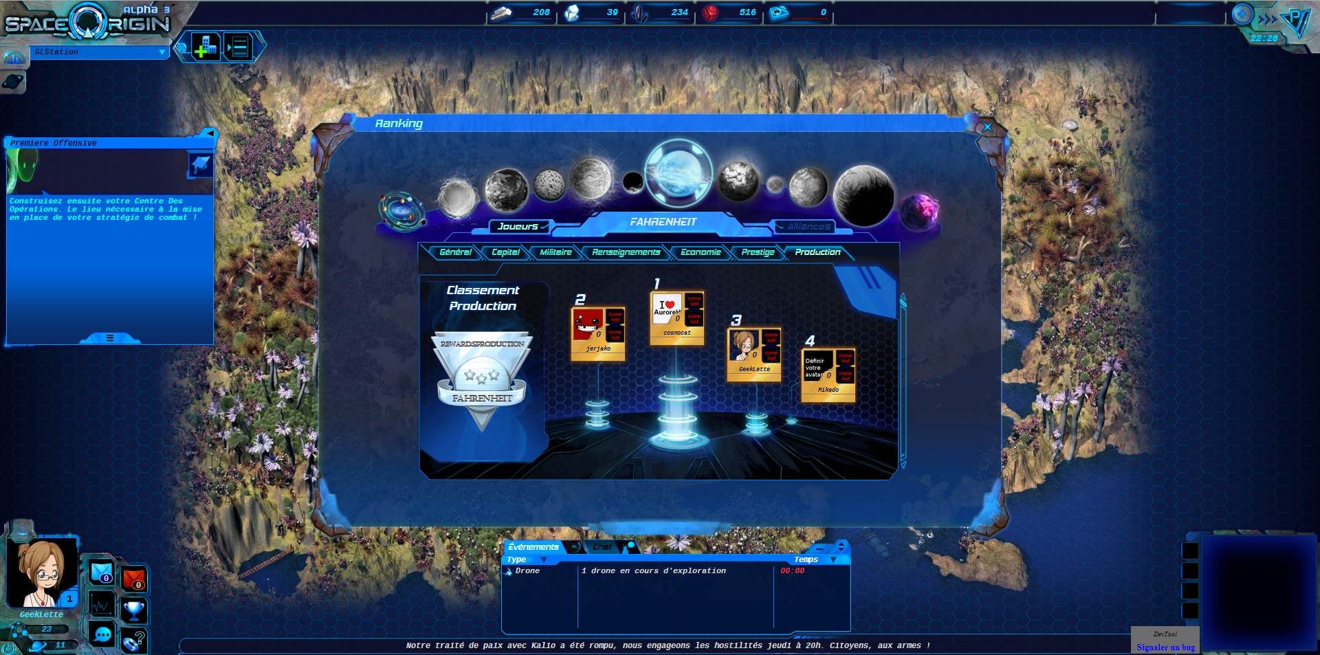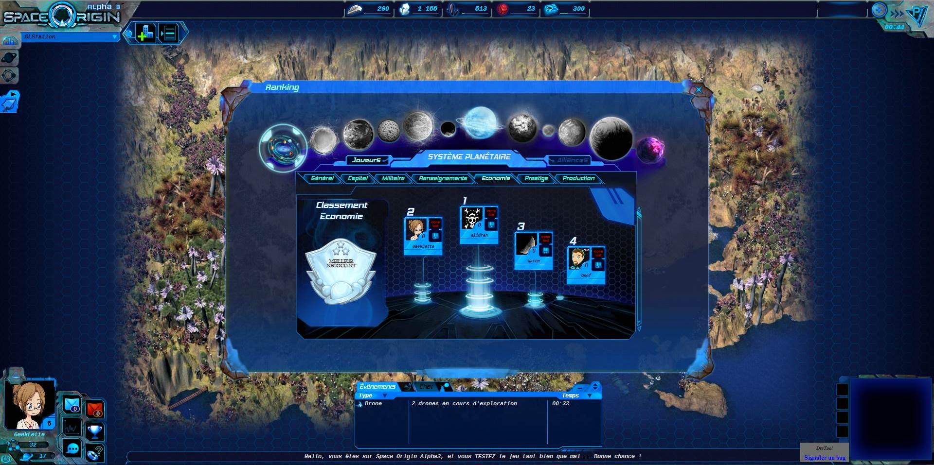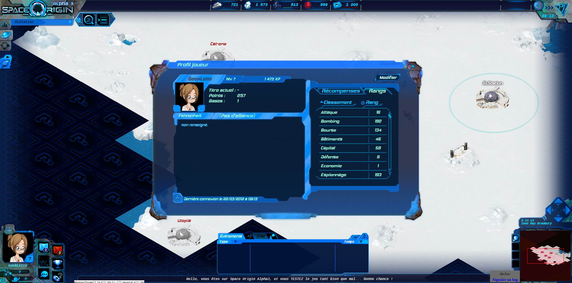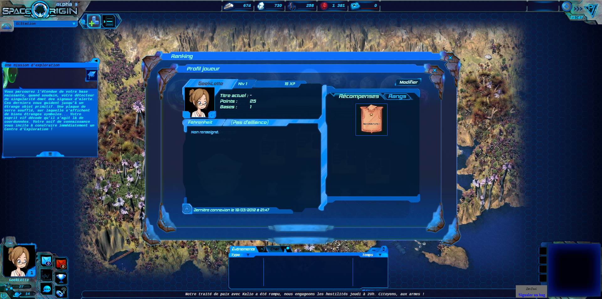 • le profil (comportant son classement global et classement sur sa planète, avatar, niveau, point d’xp, description…).