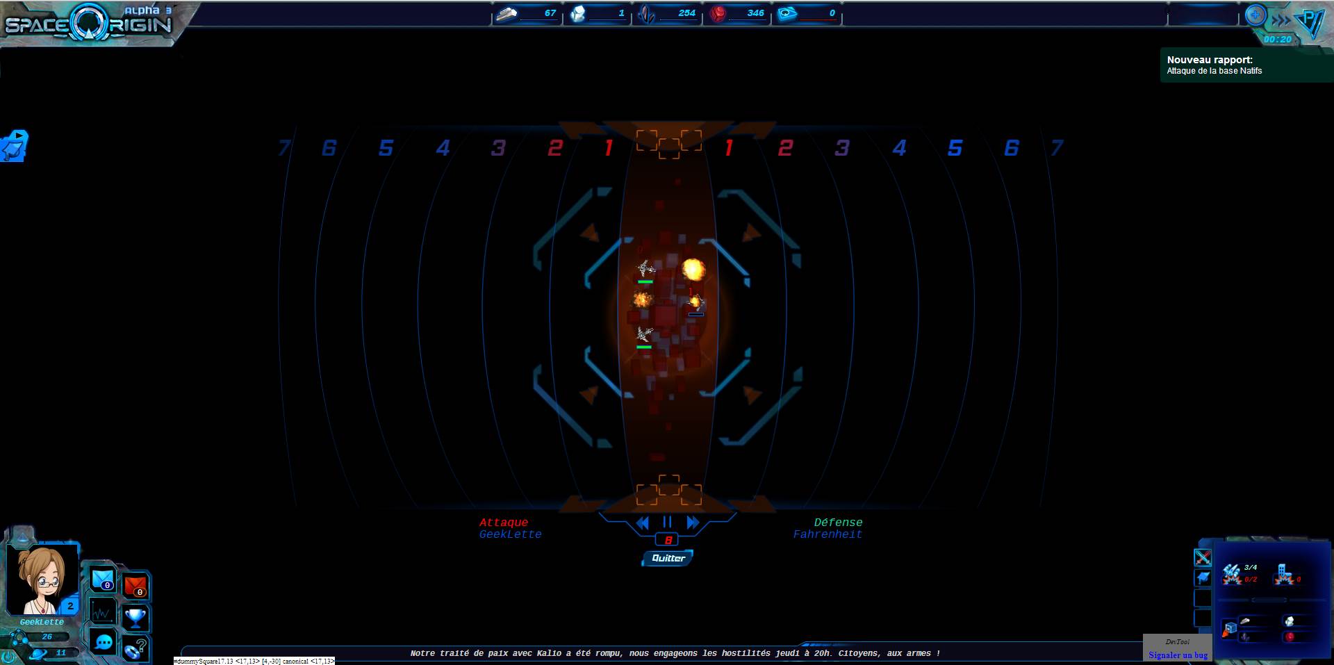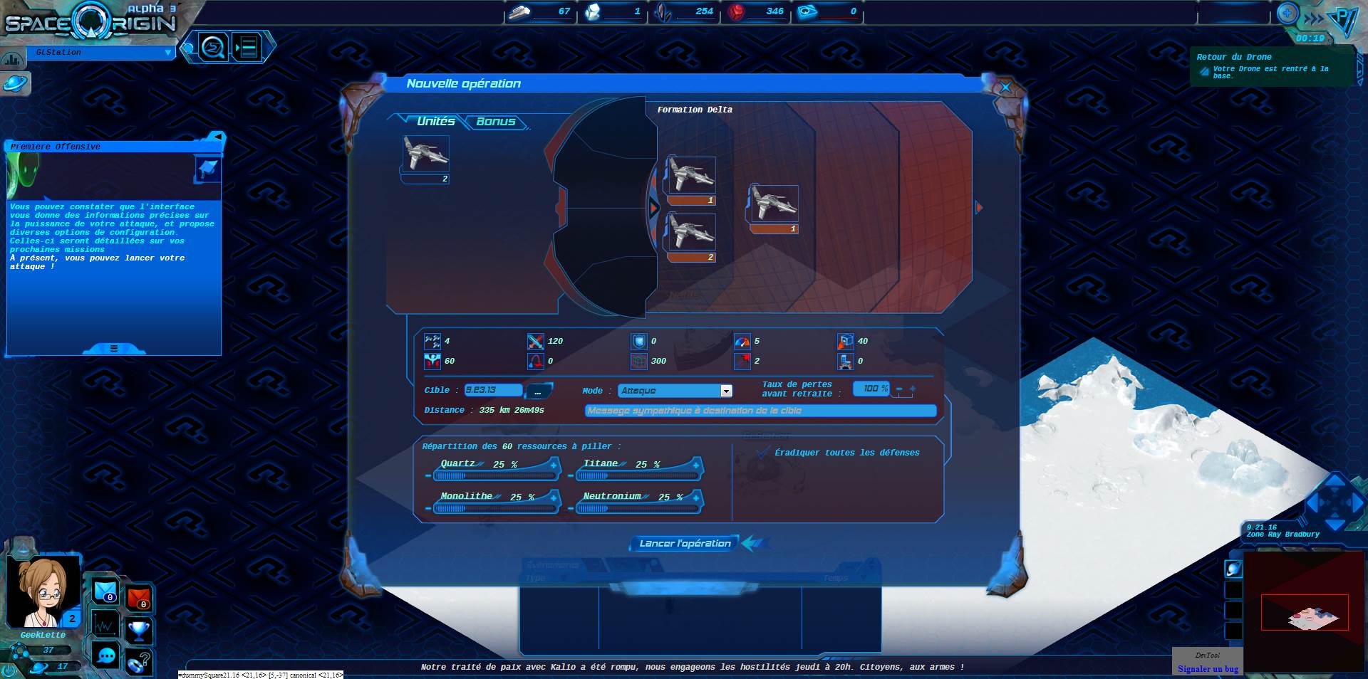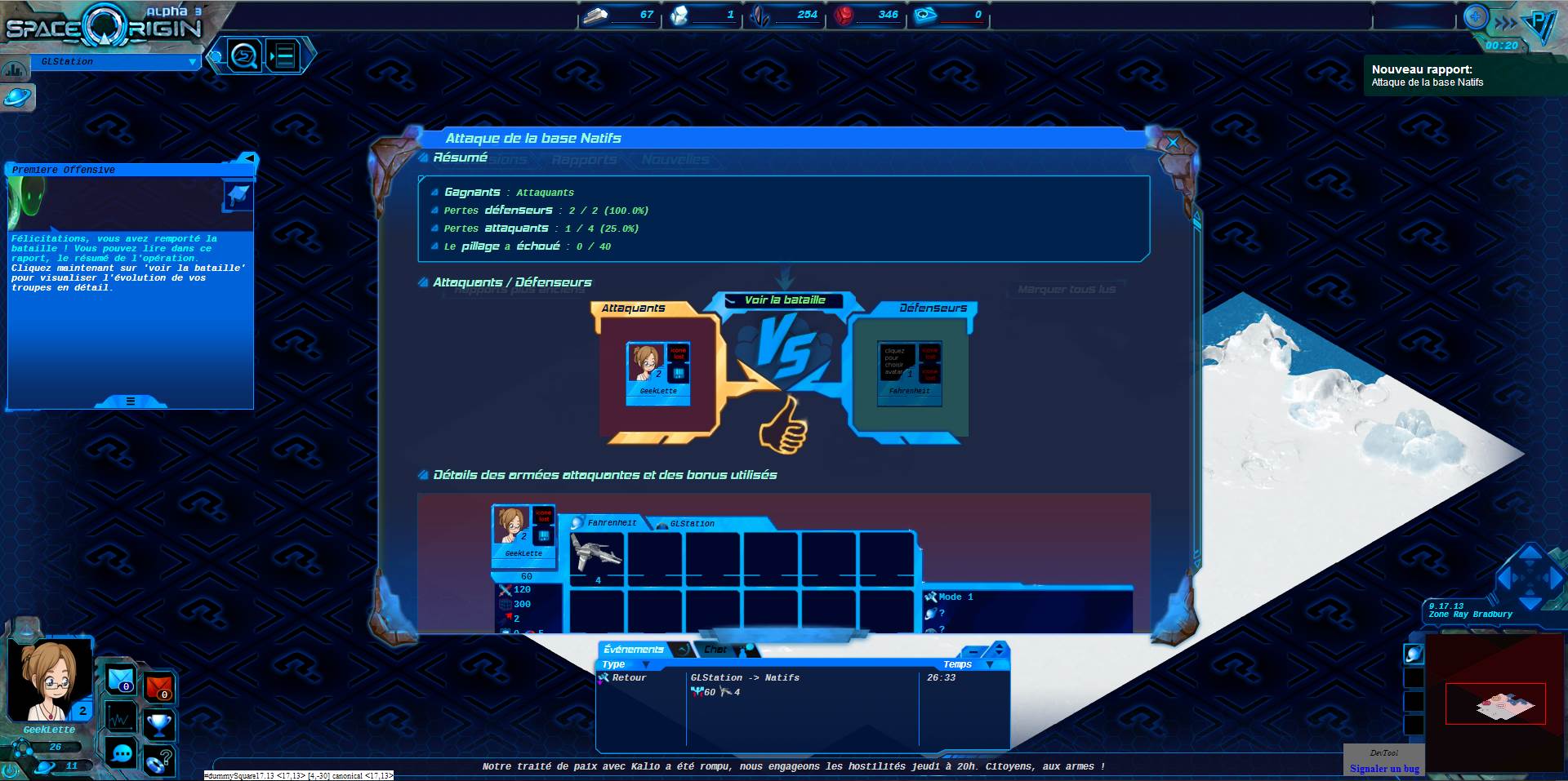 • Pour 2 attaques effectuées 2 ont réussies, car les bases adversaires n’étaient pas protégées. Quand vous quittez le jeu, il faut penser à former votre défense avec vos vaisseaux. Les attaques sont lancées avec les vaisseaux souhaités et la formation souhaitée. Par contre, cela prend  entre 20 et 50 minutes pour les bases sont proches (le temps à vos vaisseaux de se déplacer),  pour les autres comptez beaucoup plus de temps évidemment. L’amélioration de certains bâtiments permet aux vaisseaux d’être plus rapides.