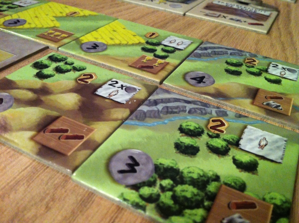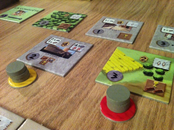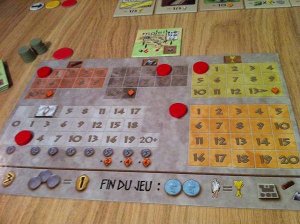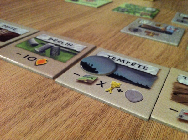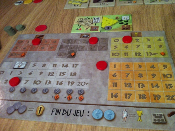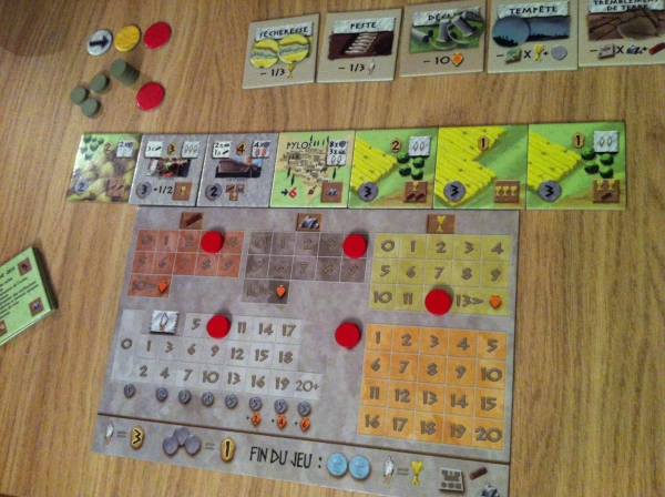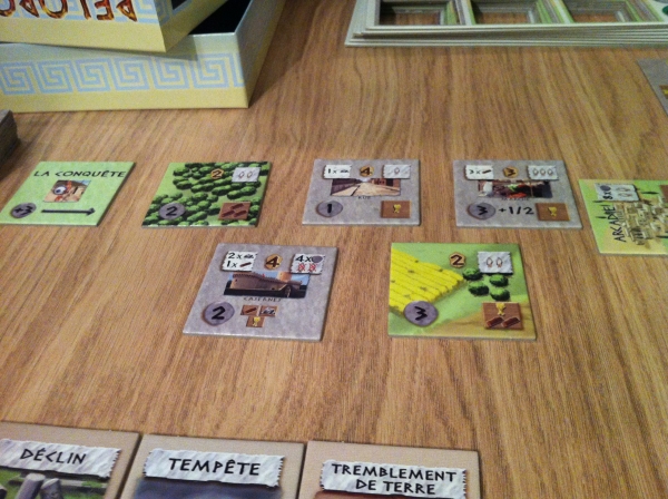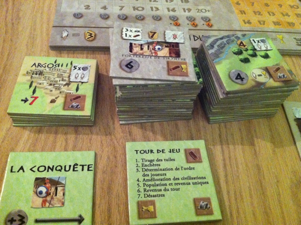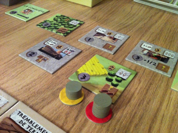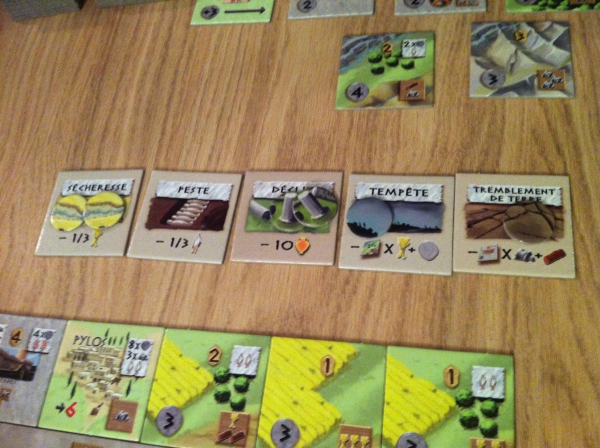 Juste une remarque : les photos ne reflètent pas une partie réelle, si ? Comme il y a 8 tours, on a chacun au maximum 8 tuiles terrain/bâtiment en fin de partie et sur les images la partie n’est pas finie (tous les désastres n’ont pas eu lieu) et il y a 9 tuiles autour des cités ! 🙂