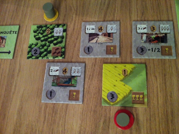 - les tuiles d’enchères (nombre dépendant du nombre de joueurs) face visible : elle représente les bâtiments et les terrains