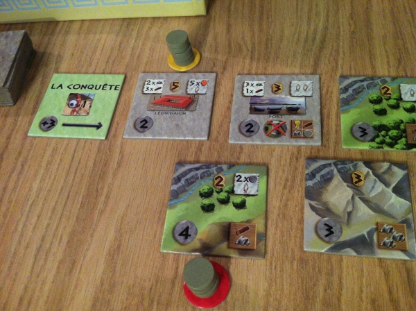 - Tirage des tuiles à mettre aux enchères (et approvisionnement si tuile associée tirée : les joueurs doivent nourrir leur population)
