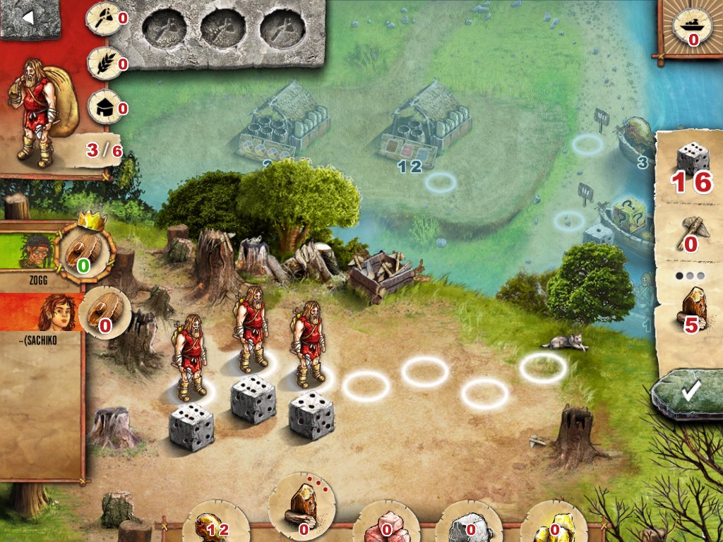 • les zones de chasses : foret, carrière, montagne… pour obtenir différentes ressources en fonction du résultat du lancé de dés (que l’on peut modifier grâce à la fabrique d’outils). Si vous y mettez x ouvriers par production vous pourrez lancer x dés et donc tripler vos gains.