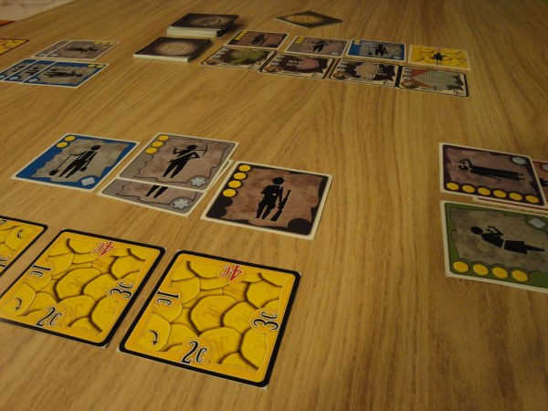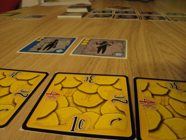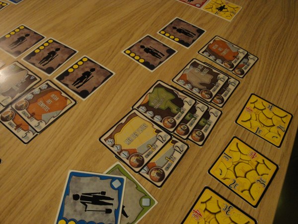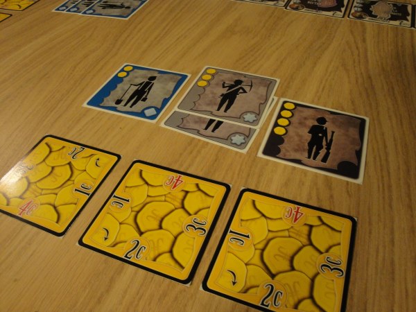 - exploiter une concession (payer le coût en carte recrutement et prendre la carte concession dans sa main. La carte concession peut être choisie parmi les 4 visibles sur la table ou parmi les concessions des adversaires mais à condition que la concession soit pas protégée par la milice et qu’elle soit isolée de ses secteurs).