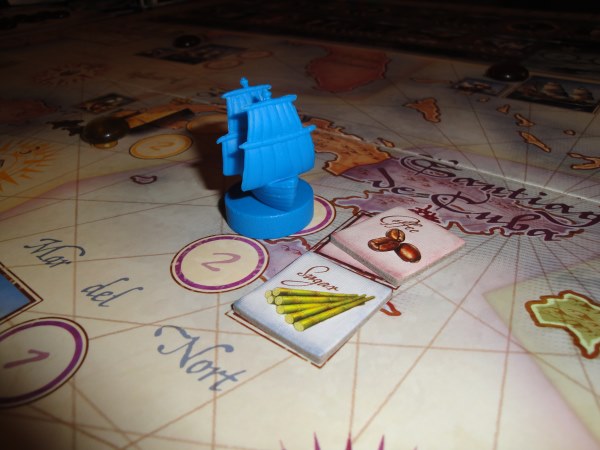 - la phase de navigation : il y a 4 étapes dans cette phase : placement des défenses des lieux du plateaux (par les joueurs ayant pris le rôle en phase 1), pose des disques 1 à 4 + ceux gagnés mais face cachée, révélation des disques de chacun et jouer les actions dans l’ordre de disques. Si deux joueurs ont placé leur disque 1 sur l’attaque d’un fort, celui qui aura terminé la phase 1 en premier gagnera l’action 1 du fort : remporter la victoire contre le fort en défaussant canons & équipages nécessaires, contre 1 gemme et des points de victoire. Mais le second joueur pourra quand même lui aussi attaquer le fort et gagner des points mais ne gagnera pas la gemme. C’est pareil pour le commerce, le premier joueur pourra choisir sa ressource parmi 2 ou 3, et le second parmi celles restantes.