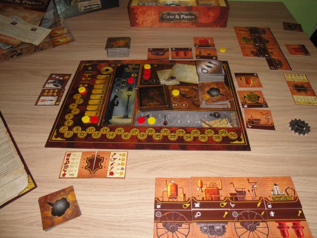 Mon premier pledge sur Kickstarter (plateforme de financement participatif) fut pour Gear & Piston. Le succès de la campagne (terminée le 21 mai dernier) a permis de débloquer une extension et un magnifique jeton « premier joueur » en métal et sous la forme d’un engrenage.