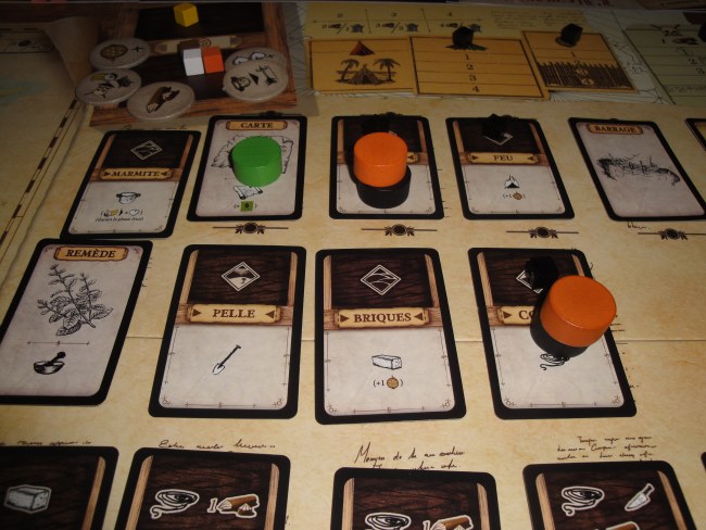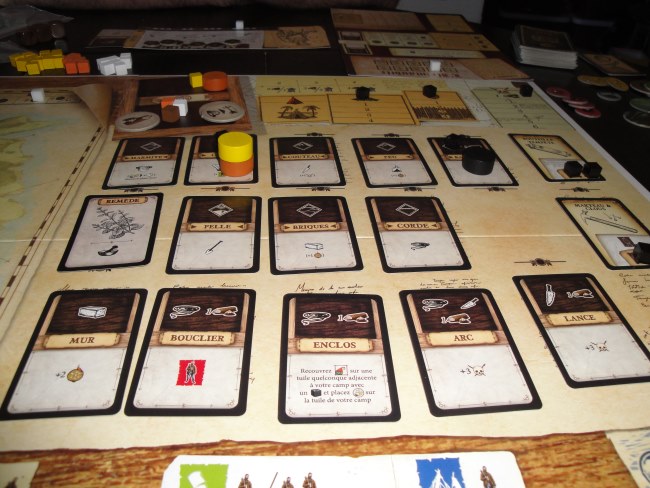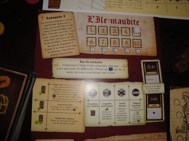Alors justement pour remporter la victoire, les joueurs doivent remplir l’objectif du scénario avant la fin du dernier tour et surtout que chaque joueur soit encore en vie. Nous avons pris le scénario 2 (les autres joueurs ayant déjà fait le scénario 1) qui consistait à exorciser les mauvais esprits de l’île et pour ça on devait construire 5 croix avant la fin du dernier tour, tout en se protégeant des dangers accablants et progressifs (faut le dire) de l’île.