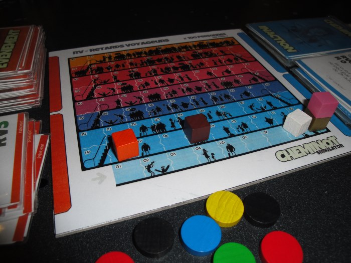 J’ai pu jouer à 2 prototypes de ce jeu et l’auteur est à l’écoute des avis de chacun. C’est d’ailleurs à cette occasion qu’une piste de score a été rajoutée. En plus de suivre l’évolution des joueurs, ce plateau permet de placer les cartes événements et inaction avec leur défausse. La table de jeu est ainsi mieux organisée et les parties s’en trouvent plus agréables.
