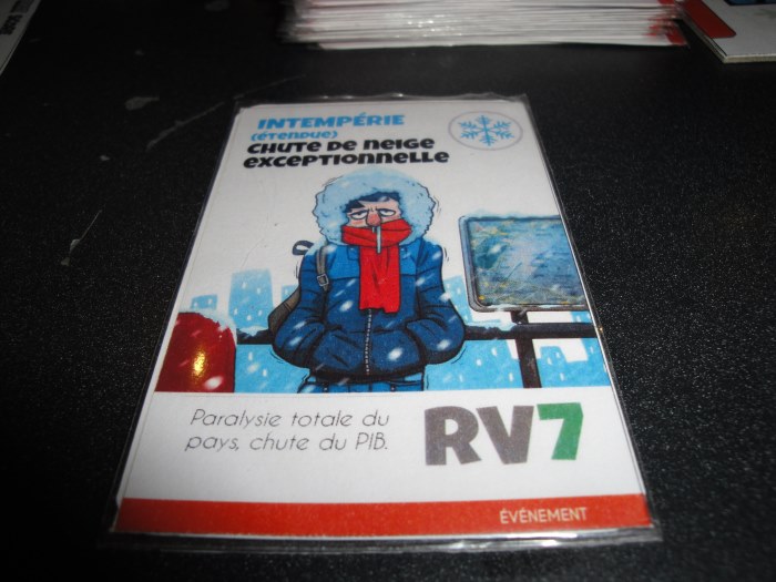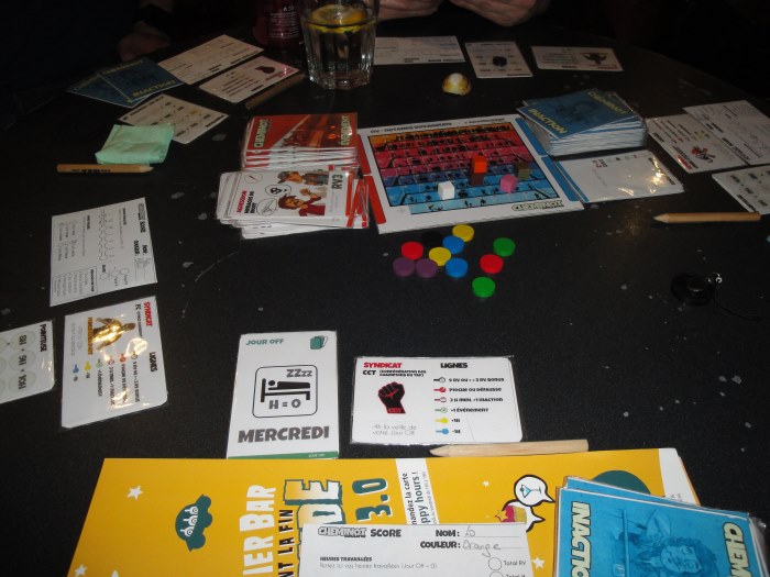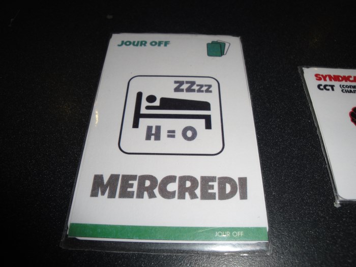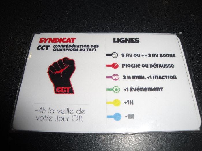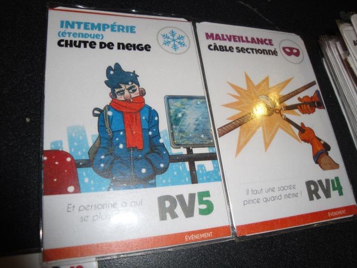 Donc en gros, quand à votre tour : il faut jouer des cartes inaction (maladie, grève…) qui mettent encore des voyageurs en retard et/ou vous permet de perdre quelques heures de travail. Mais vous pouvez aussi (et à tout moment, pas forcément si c’est votre tour) pourrir les autres à condition qu’ils travaillent sur une ligne (un joueur qui n’a pas encore joué son tour est intouchable).