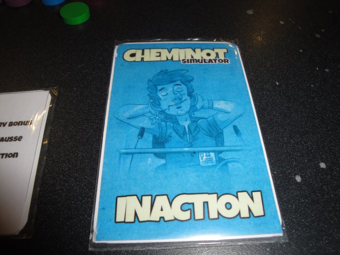 - pioche ensuite une carte inaction et va pouvoir jouer autant de cartes inaction de sa main qu’il le souhaite à condition que la carte corresponde à sa ligne ou à l’événement qu’il a « subi » (les cartes ont des symboles… pour une meilleure cohérence des incidents et problèmes rencontrés). Les cartes inactions ont plusieurs objectifs : mettre des voyageurs en retard, travailler moins, pourrir les autres…