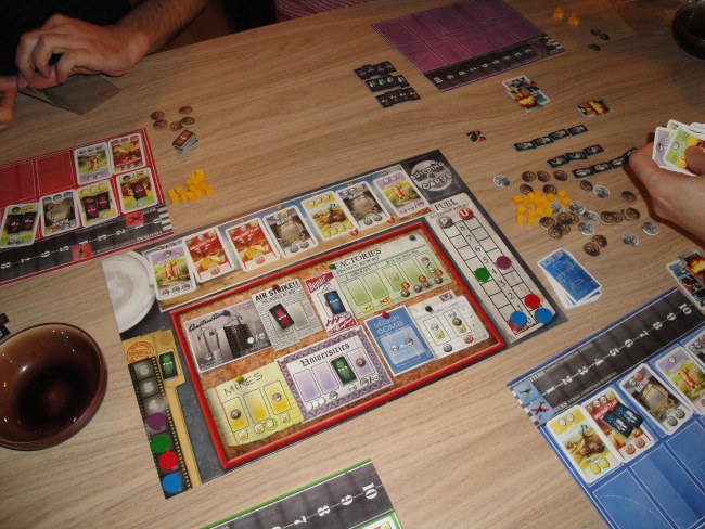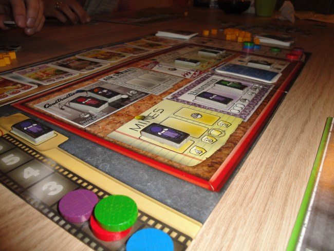 - placer ses ouvriers de manière à effectuer une action sur le plateau central (en posant un ouvrier ou plusieurs et/ou payer le coût en dollar et/ou ressource) et effectuer toutes les actions souhaitées (évidemment si condition remplie) sur son plateau principal que l’on améliore en achetant les bâtiments via le plateau centrale