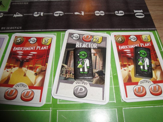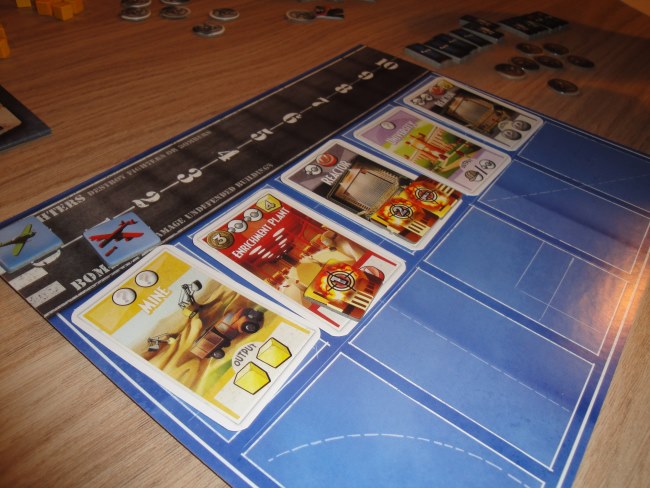 The Manhattan Project est incroyable. Il propose un mélange savant de mécaniques (pose/combo/stop ou encore) qui, même si l’on a un qu’une seule façon de scorer, diversifie nos tours de jeux : l’espionnage, les attaques aériennes, la construction de bâtiments, le recrutement, la production… Un mélange explosif (on peut le dire) et diablement efficace. Le jeu se décompose en 2 parties : la partie de placement pure (on se développe mais on se place là où les adversaires aimeraient aller), ensuite c’est la course, les batiments construits doivent nous permettre d’accélérer notre capacité d’armement et de faire péter les bombes tout en freinant les adversaires. On devra anticiper, planifier et se synchroniser avec les autres pour optimiser nos combos. Le rappel d’ouvriers vide le plateau central et libère les places… mais savoir quand l’adversaire le fera est une autre histoire. Là où c’est fort, c’est que lorsque nos combos vont devenir trop répétitives (et donc ennuyer tout le monde), le jeu est terminé. On développe sa zone industrielle, on recrute, et au moment où tout est en place, on combote si rapidement que le joueur largué ne pourra pas rattraper son retard. La petite tension de fin est agréable. C’est un jeu très fourni donc et pourtant très fluide.
