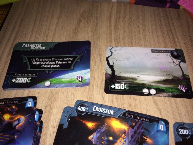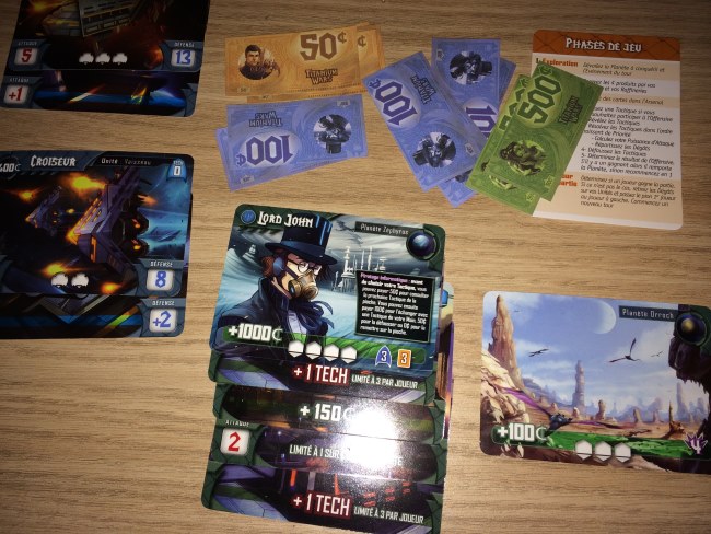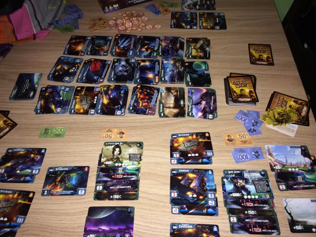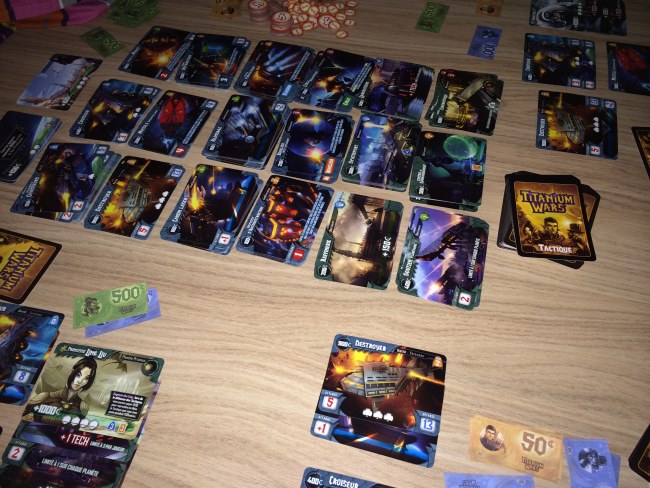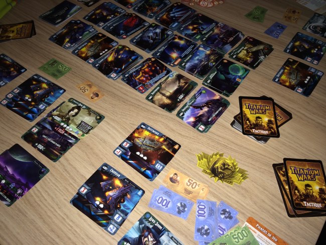 Alors Titanium Wars? Vous savez, les cartes et moi ça fait deux… et pourtant j’ai trouvé le jeu hyper immersif grâce à ses illustrations (qui ont nécessité 4 personnes, quand même) et grâce à la mécanique : on achète pour se préparer à la conquête et on croise les doigts pour que les autres soient moins forts ou influençables… La diplomatie est de mise et je n’y avais pas trop fait attention. J’ai aidé à défoncer un croiseur pour avoir la planète, sauf que le joueur s’est vengé avec une main de départ sacrément chanceuse aux deux derniers tours. Du coup il a gagné. Mais j’y ai pris beaucoup de plaisir car savoir attaquer mais ne pas être le premier à porter le coup peut s’avérer fatal.