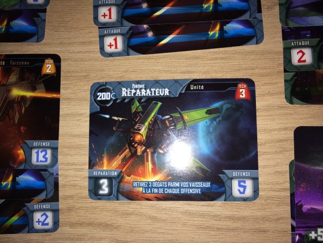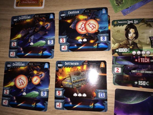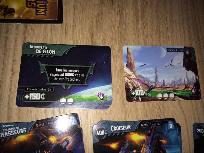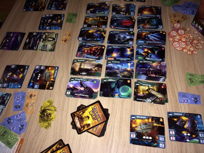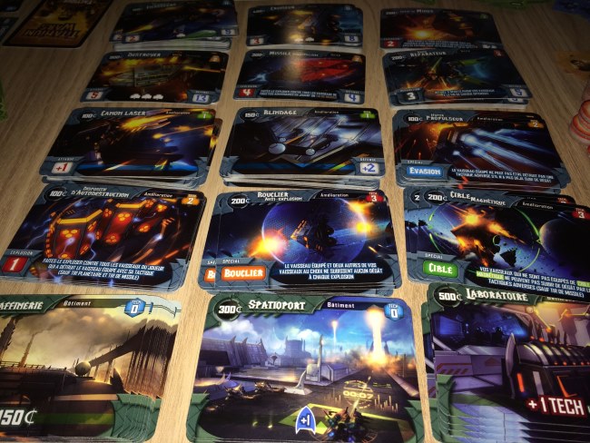 La table est très chargée (ce qui rebute beaucoup de monde) mais finalement elle est principalement occupée par les unités, améliorations et bâtiments que l’on peut acheter. Chaque joueur a quand même besoin de son coin de table pour gérer sa flotte et ses planètes mais les cartes s’empilent intelligemment pour ne pas avoir besoin de 6 mètres d’espace.