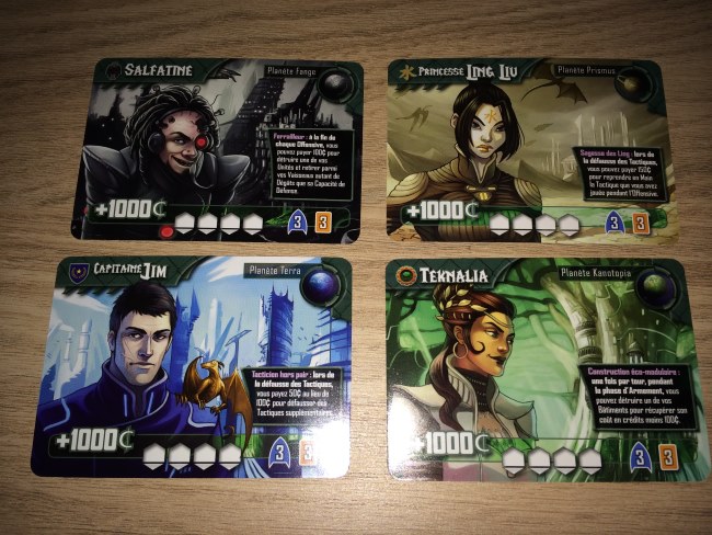Dans Titanium Wars, les joueurs incarnent chacun un personnage avec un mini pouvoir et le but est d’être le premier à conquérir assez de planètes pour avoir le Titanium requis pour gagner. Chaque planète (ou pas) a son gisement de Titanium d’une certaine valeur. Si vous atteignez 7 gisements (partie rapide sinon +), vous gagnez. Mais pour coloniser, il faut non seulement développer sa flotte mais aussi tenter de prévoir ce que vont faire les autres joueurs lors de la phase de « conquête » car l’affrontement entre flotte ne laissera gagner qu’un seul d’entre vous. Pour cela, par tour de jeu, il y a plusieurs phases :