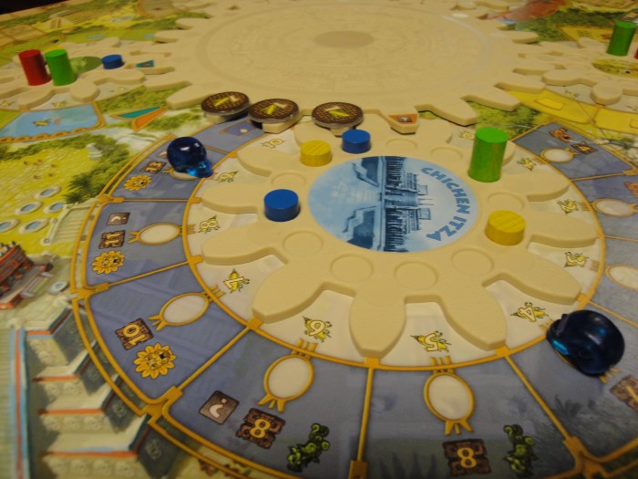 Il y a au total 5 roues : la principale qui tourne les 4 autres. Ces 4 roues permettent de récupérer des ressources (nourriture y comprise), de construire, de faire des offrandes aux Dieux, développer des « savoirs »…