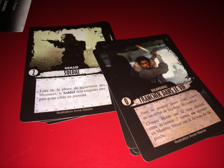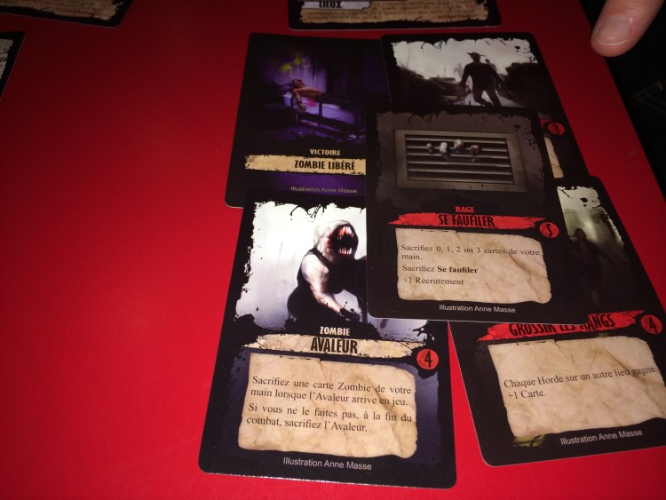 - jeu riche à multiples facettes : côté humain c’est du développement avec gestion de ressources , côté zombie c’est du deck (plus vous pénétrez les lieux, plus vous recrutez, n’oubliez pas de défausser vos blessés)