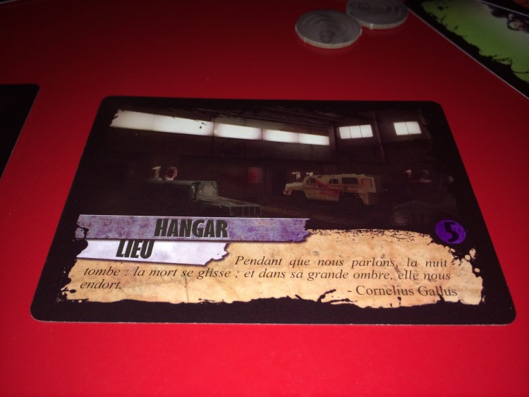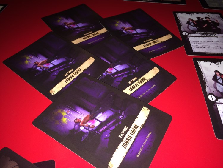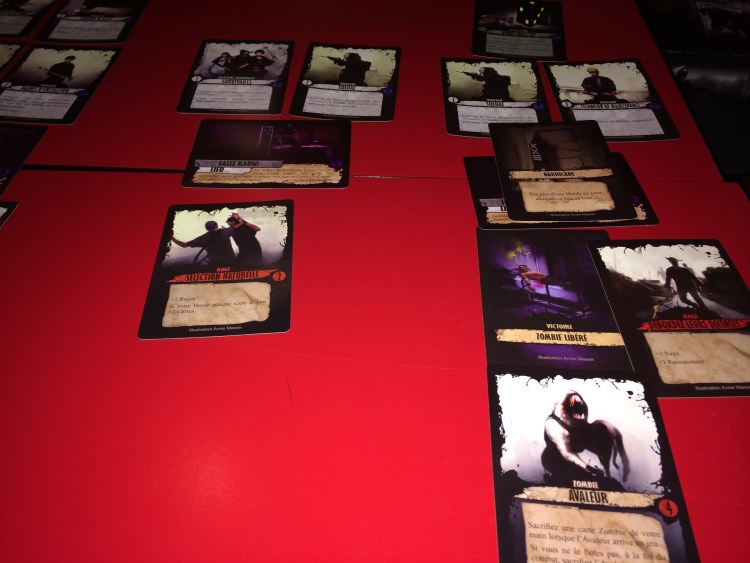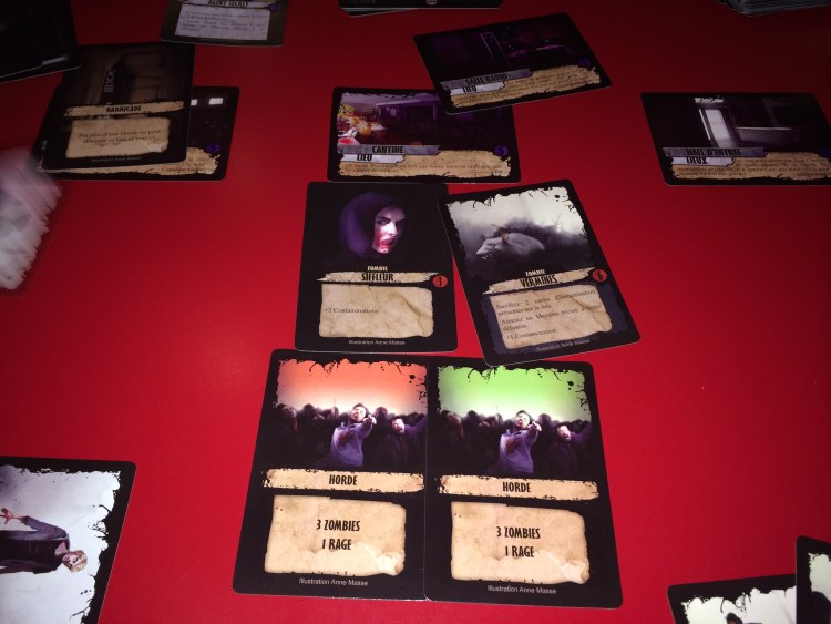Pour cela, 3 cartes « Lieu » sont placées au centre de la table. Les humains jouent au dessus, les zombies en dessous. Je vous épargne la mise en place car plusieurs scénarios sont possibles.