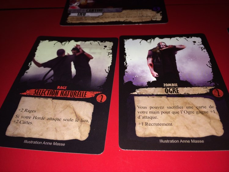 En gros, les humains disposent de ressources qu’ils vont pouvoir utiliser pour défendre les 3 lieux en jouant des cartes qui permettent de placer des soldats, agents secrets et j’en passe, pour défendre le centre de recherche ou tout autre labo permettant de gagner des points etc… Une fois, la défense mise en place, les joueurs jouant les zombies vont tenter de pénétrer dans les 3 lieux (grâce aussi à leurs cartes) : soit ils attaquent ensemble, soit ils attaquent séparément (un joueur peut attaquer le hangar pendant que l’autre ou les autres attaquent la cantine). Si les zombies pénètrent dans un lieu, ils peuvent commencer à tuer les humains qui défendent les lieux voire anéantir les centres de recherche si bien protégés. Mais en plus d’éliminer les humains, ils pourront recruter d’autres zombies (ou cartes à effet). Ces cartes à effet sont placées devant chaque lieu au début du tour. Evidemment, les zombies vont tenter d’attaquer les lieux qui ont des cartes intéressantes puisque ces cartes finiront dans leur deck.