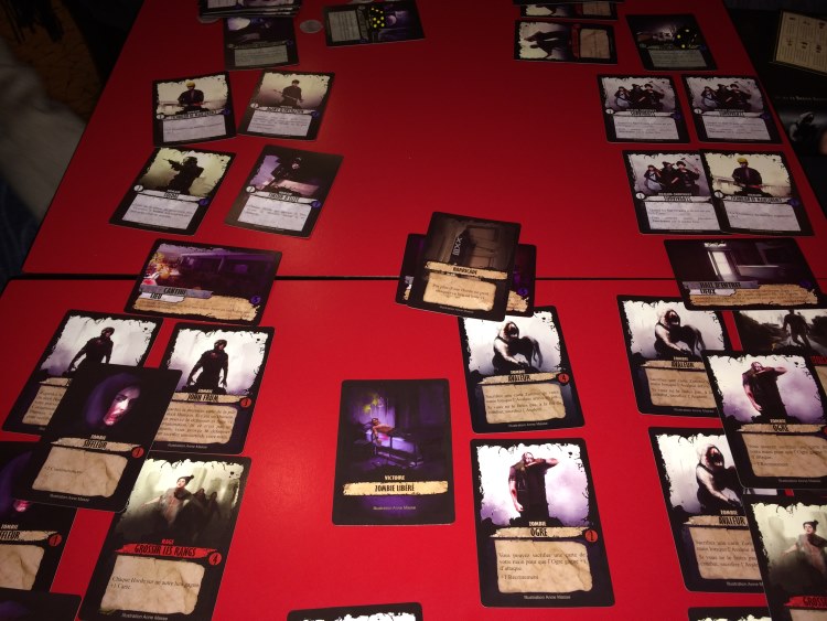 Le thème est hyper bien rendu, comme vous le pouvez le constater. Alors, la connaissance des cartes est un vrai plus mais après 2 ou 3 parties, cela viendra naturellement. Je me souviens de ma petite carte qui permettait de se faire aider par des zombies de notre pioche. Bref, on prend un réel plaisir à s’affronter tout en mettant en place une stratégie de combat. Chaque joueur apporte sa petite idée, le coopératif ne révèle pas un leader mais plutôt une équipe qui s’entraide pour atteindre le même objectif. Le jeu propose un ensemble cohérent, fortement travaillé et donc équilibré. La tension qui règne en fin de partie nous fait définitivement aimer le jeu. Les cartes tournent, on ne sait pas si on aura de bonnes cartes au prochain tour pour envoyer notre horde bouffer de l’humain. Bref, j’avoue avoir été conquise.