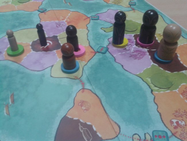 Par la suite, on est étonné de la rapidité de la partie, car le plateau se remplie à vitesse grand « V », rendant la réalisation de vos objectifs de plus en plus complexe. C’est généralement à ce moment que les échanges de territoires font rages ! Les 45 minutes de durée de partie inscrites sur la boite ne sont pas un mensonge.