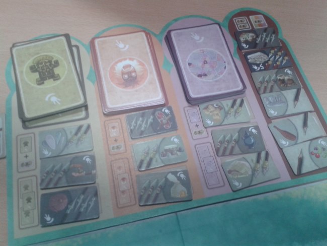 Après avoir réalisé l’une de ces actions, vous avez la possibilité de gagner des cartes bonus et des jetons innovations. Pour cela, rien de plus simple, il vous suffit de prendre votre bonus dans la pile de carte de couleur correspondant à la case où se trouve votre totem :
