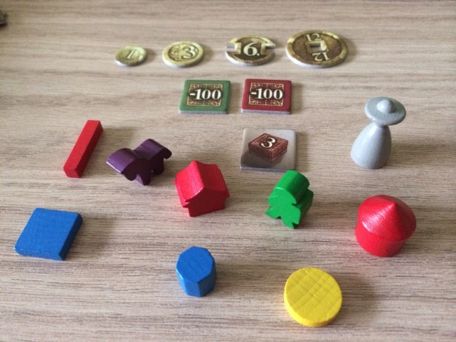 - beau matériel (meeples personnages, chevaux et bâtiments, tuiles, pièces en carton, divers marqueurs)