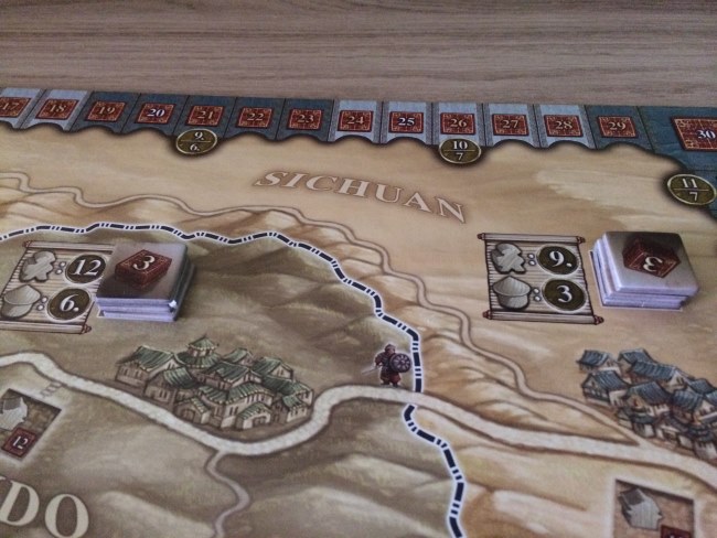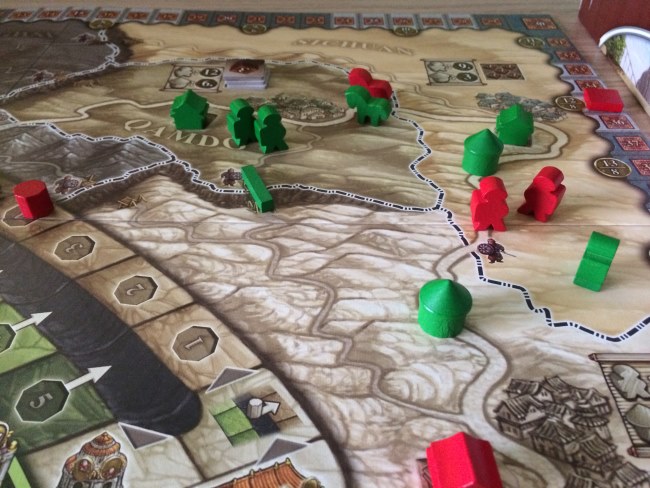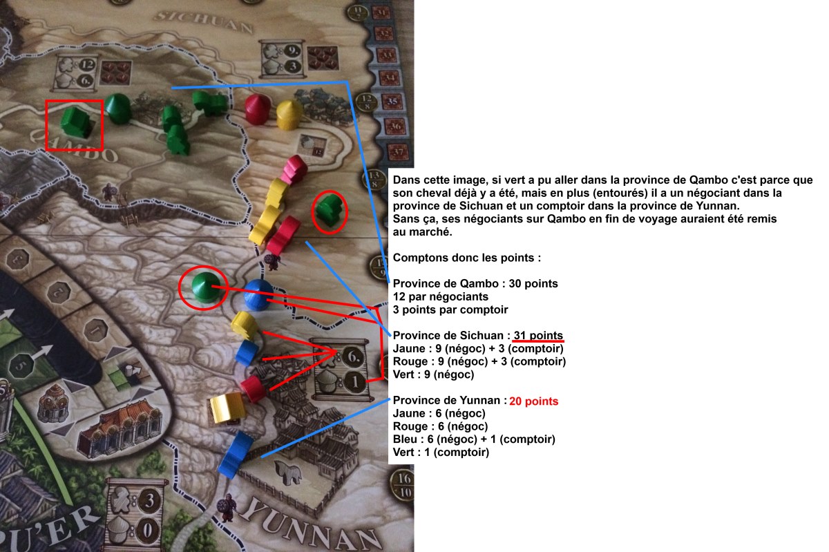 - ici, la province concernée est celle de Sichuan, personne n’a de maison de thé sur cette province, donc l’inspecteur s’attarde sur rouge et jaune qui ont le même score. Il va alors vérifier celui qui a le moins d’influence (grâce à la maison du dragon) et celui qui en aura le plus sera sauvé, l’autre verra son négociant repartir au marché ! Mais si les deux joueurs ont le même score en influence, l’inspecteur va choisir celui qui a commencé son voyage en premier (donc il va regarder l’ordre du tour).