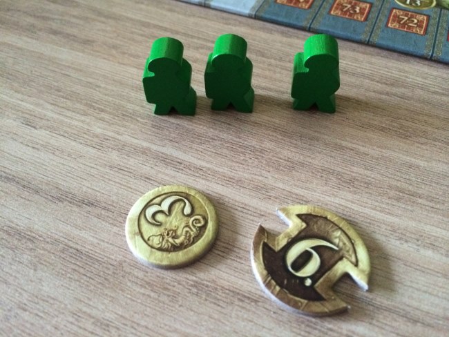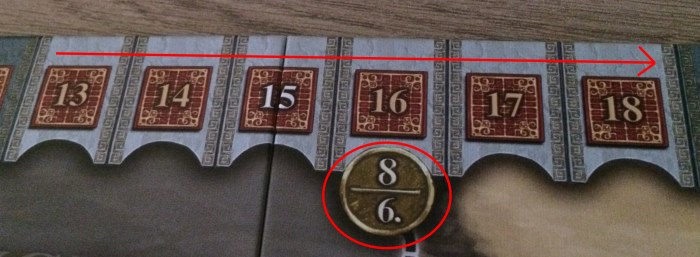 - le groupe d’enchère 5 & 7 (qui coûtent 5 & 7 pièces) : le joueur qui place un négociant sur le 7 retire le négociant placé sur le 5 (la place 5 devient inutilisable). Le joueur qui place un négociant sur le 9 retire le négociant placé sur le 7 (la place 7 devient inutilisable).