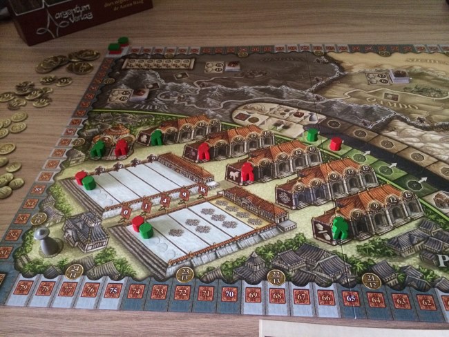 En effet sur la photo présentant la fin des enchères, on voit rouge positionné sur la banque et également positionné sur un des bâtiment d’amélioration. La règle indique que dès qu’un joueur se place à la banque il doit retirer tous ses négociants présents dans les bâtiments d’amélioration et qu’il ne peut plus positionner de négociant dans les bâtiments jusqu’à la fin de l’enchère.