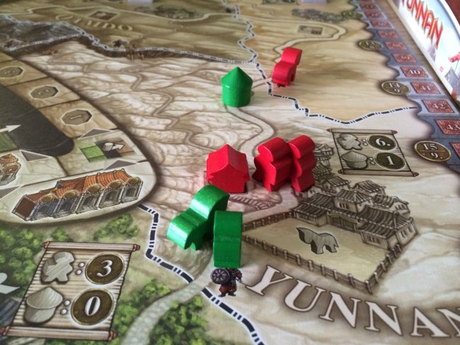 Bref, si vous jouez avec quelqu’un qui connait les règles ou si vous prenez le temps de compléter les règles écrites, vous trouverez dans ce jeu, pas familial du tout, un jeu de placement, d’enchères, de course avec des coups de puxxx aussi énormes que dans les jeux de Bruno Cathala (si si !). Je dirai même que dans Yunnan les âmes sensibles peuvent soulever la table, renverser le jeu et se rebeller à un point de mettre fin à la partie. Alors veillez à protéger celui qui n’a pas encore bien compris les règles ou celui qui a du mal à assembler ses idées.