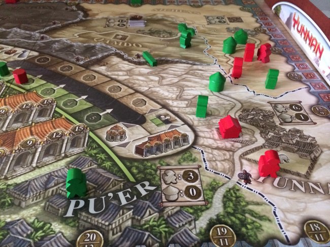 Car Yunnan raconte une histoire. On déploie une équipe sur des provinces qui doivent restées connectées. Le but étant de vendre le thé le plus loin possible sans perdre un bout de route en chemin sinon le thé n’arrivera pas à bon port. Il faut avoir l’oeil partout et surtout sur vos adversaires qui prennent évidemment la même route que vous à un moment ou à un autre. Les enchères sont impitoyables et parfois horriblement chères, il est donc question de calcul qui finit par une course effrénée mais dont le premier risque des sanctions. C’est donc avec beaucoup de retenue et d’anticipation que le voyage se prépare. Les interactions participent à chaque phase du jeu et l’observation des autres est inévitable, car évacuer un négociant adverse pour casser sa route ou mieux orienter l’inspecteur reste jubilatoire, mais la vengeance sera terrible. Donc préparez-vous à voyager mais pas tout seul.