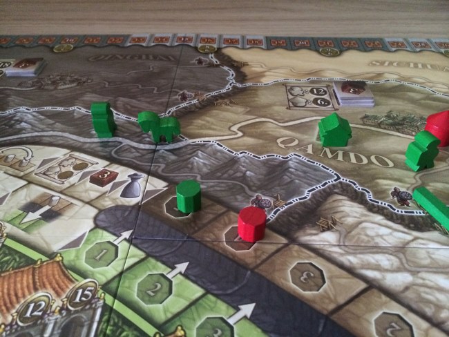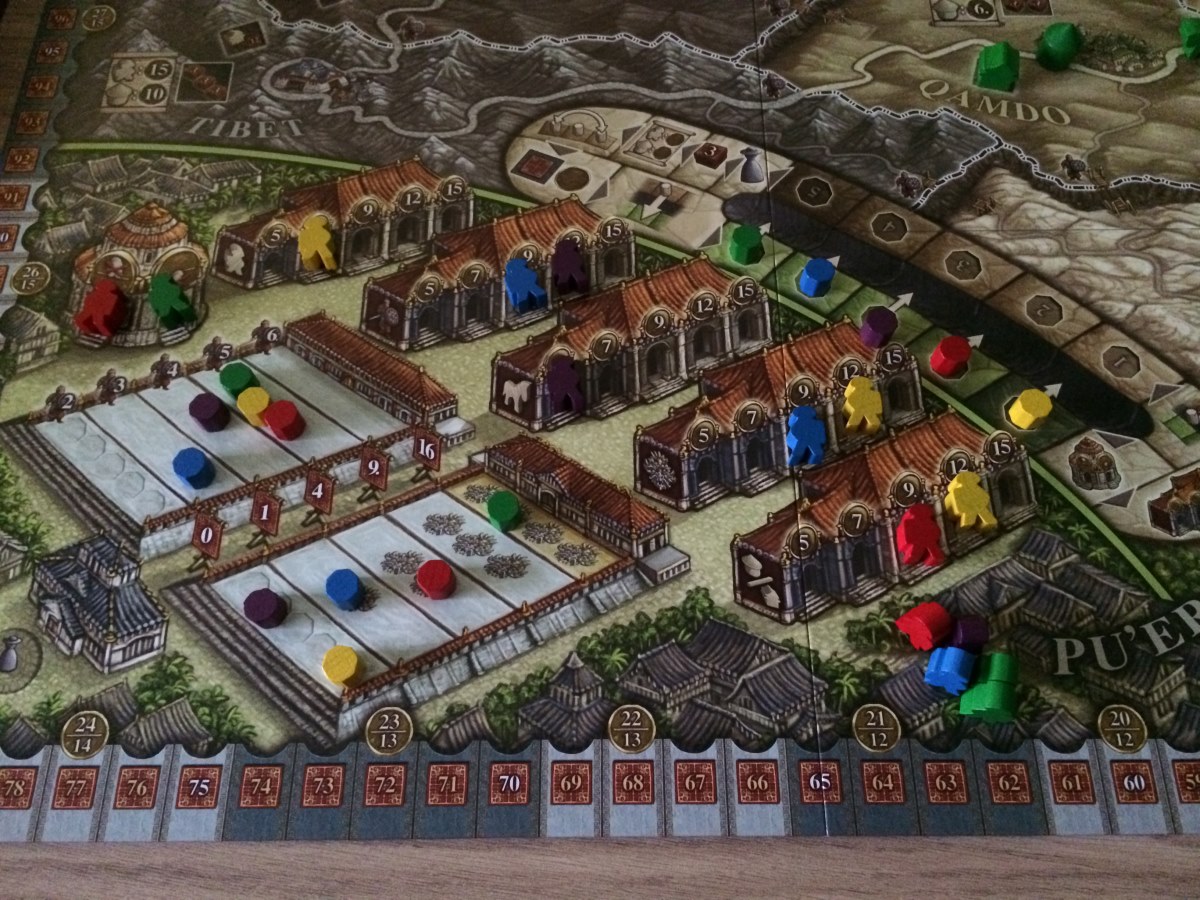 - La maison de thé vous permet d’inviter l’inspecteur et donc de le soudoyer. Si un autre joueur avait atteint Qambo avec moins de négociants que vert, vert n’aurait pas été inquiété et aurait même sauvé le joueur placé avec lui.