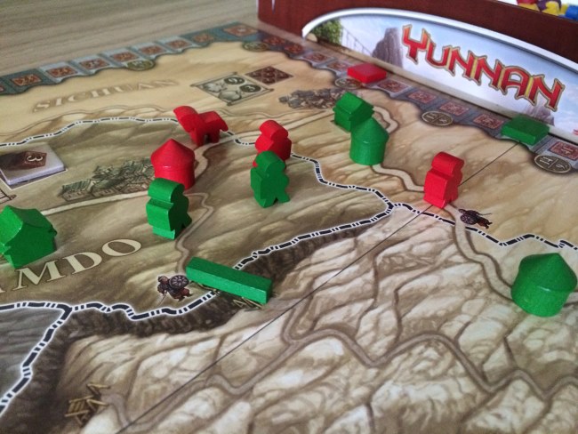 Yunnan est un de ces jeux qui souffrent du chaos lors de la première partie à cause de règles mal écrites et mal ordonnées. Les subtilités font alors place à des questionnements et des interprétations complètement fausses. D’ailleurs les photos montrent des parties à deux joueurs (parties découvertes, et surtout fausses puisque à 2 on doit jouer chacun 2 couleurs). Je remplacerai les photos sous peu puisque des soirées Yunnan sont prévues à la maison.