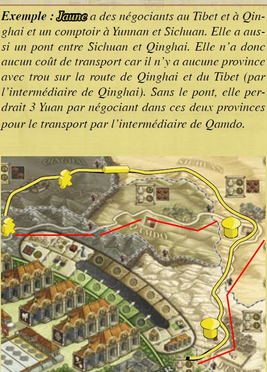 - Attention à la fin de votre tour vos négociants doivent être connectés à Pu’er : pour cela tous vos négociants doivent pouvoir revenir à Pu’er en cas de besoin et pour ça, vos négociants OU vos comptoirs doivent se trouver sur la route qu’ils ont emprunté ou bien sur la route empruntée grâce à un pont. S’il y a des trous : vos négociants non connectés repartent au marché de Puer et vous perdez des points et en plus vos négociants ne pouvant revenir ne peuvent pas vous servir en cas de besoin pendant la phase enchères. Car effectivement, si vous manquez de négociants pendant la phase enchères, vous pouvez en reprendre un qui est en voyage mais qui peut revenir ! Par contre vous devrez recommencer son voyage à zéro (évidemment).