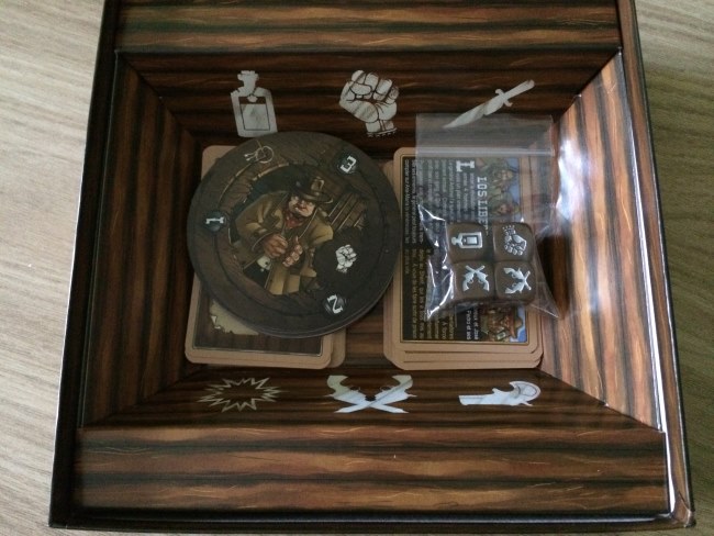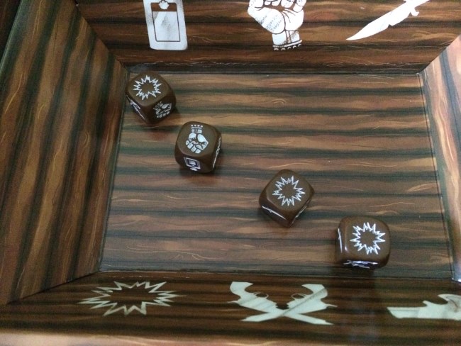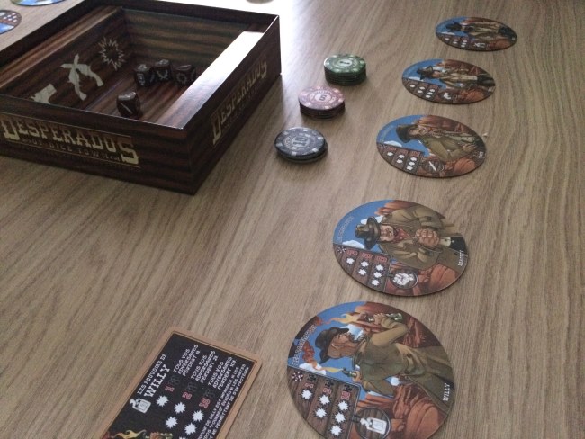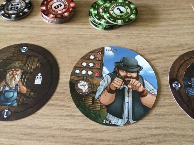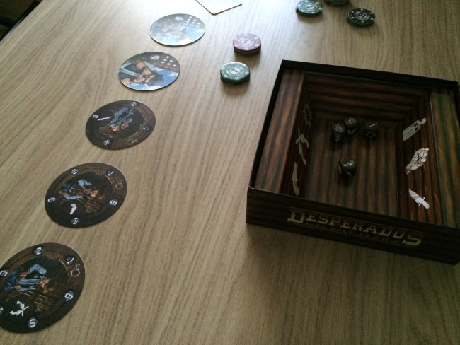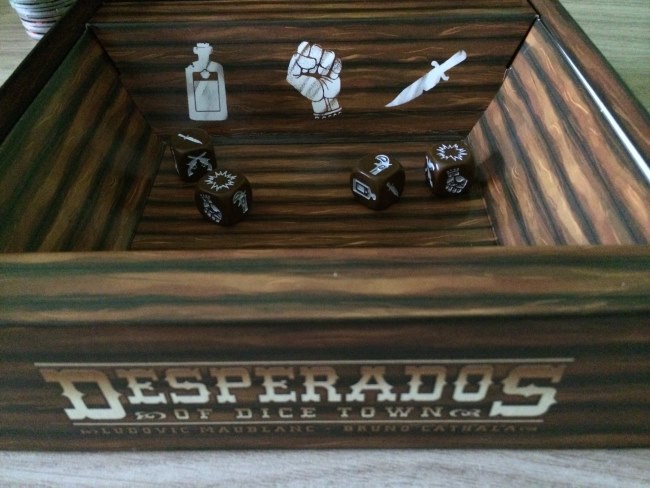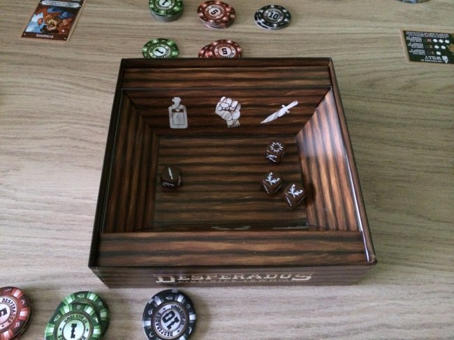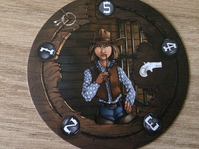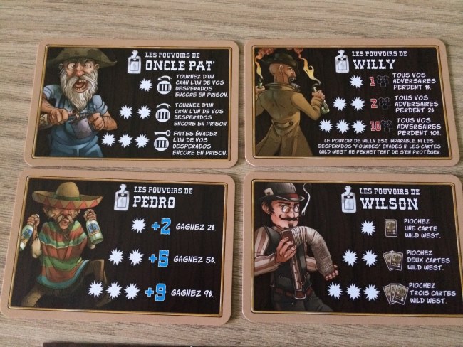 Dans Desperados of Dice Town, vous allez devoir faire sortir vos brigands de prison tout en étant le plus riche. Pour cela, des dés sont mis à disposition représentant les symboles de chaque prisonnier.Vous avez droit à 3 lancers. Mais pour faire agir un prisonnier (permettre l’avancement de son évasion ou bien s’il est évadé, permettre de gagner de l’argent auprès des joueurs n’ayant pas encore fait évader le prisonnier de ce même symbole), il faudra non seulement avoir le dé correspondant à son symbole mais en plus avoir un dé « action« . Si rien n’est possible, il est prévu de tirer des cartes donnant quelques pouvoirs (parfois bien violents surtout quand les parties sont serrées et pour nous elles l’ont toutes été).