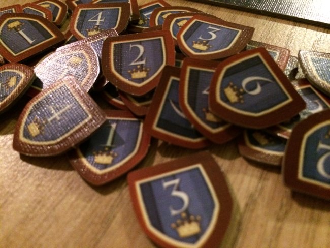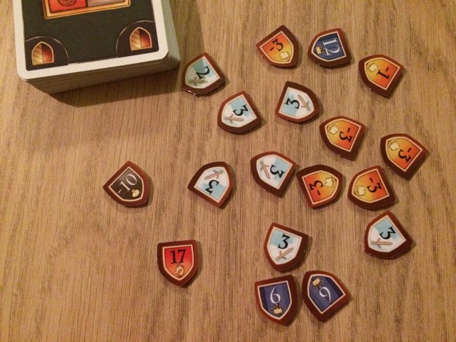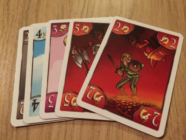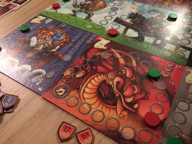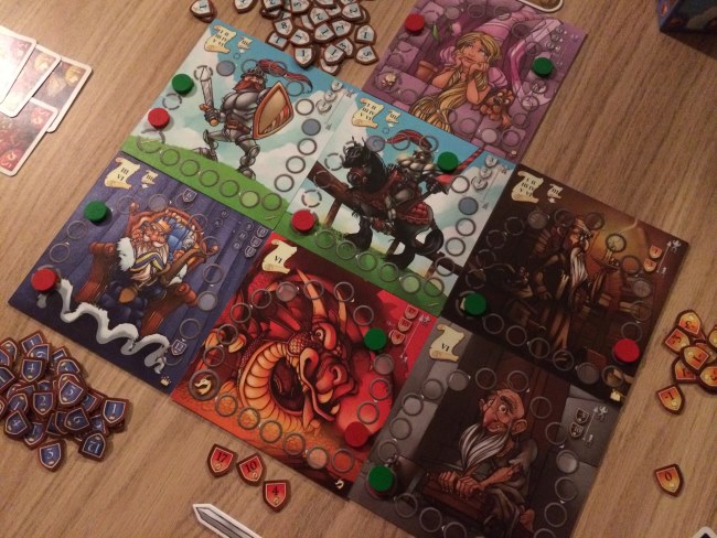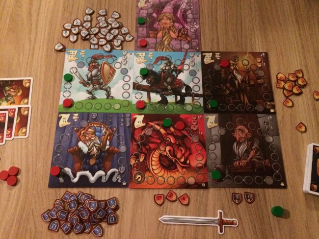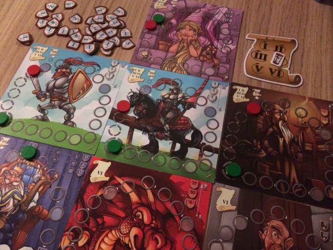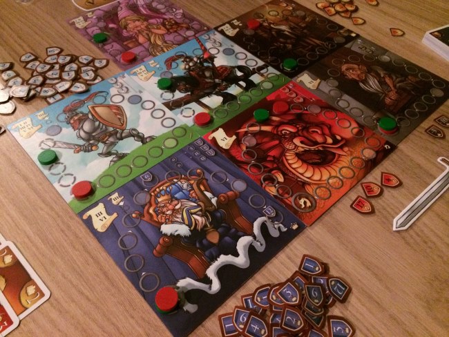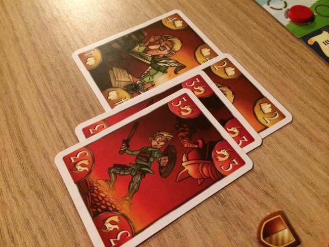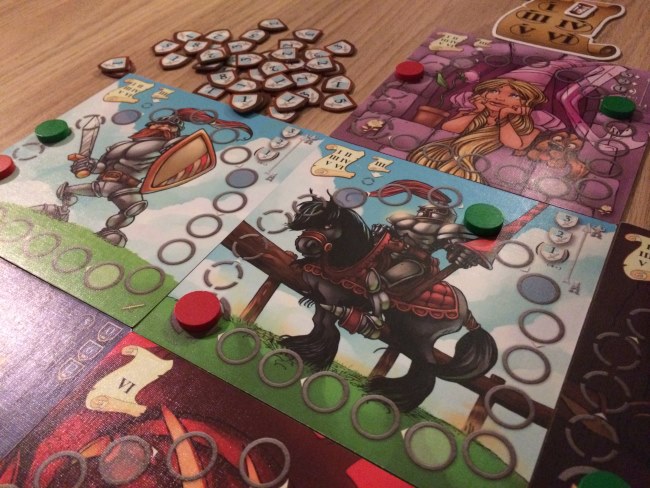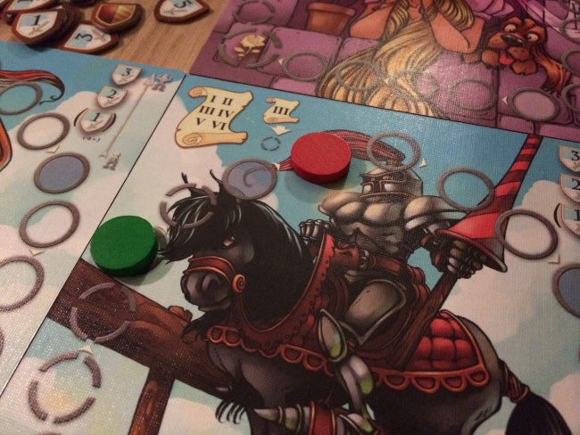 Et pour cela, des cartes… Chaque joueur reçoit 5 cartes et à la manière de 7 wonders, chaque joueur choisit une carte et donne les 4 autres à son voisin. Et ainsi de suite. En 6 tours de jeu, les joueurs vont déposer les cartes choisies et ainsi faire avancer leur pion sur le plateau correspondant à la carte d’autant de cases qu’indiqué sur la carte. Pas difficile hein ! Mais chaque plateau d’entrainement représente une catégorie qui apporte des points ou en fait perdre aux jeunes insouciants à la traîne ! La galanterie a un petit pouvoir sympa car permet aux meilleurs chevaliers de déplacer un pion de x cases sur d’autres plateaux d’entrainement.