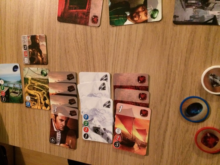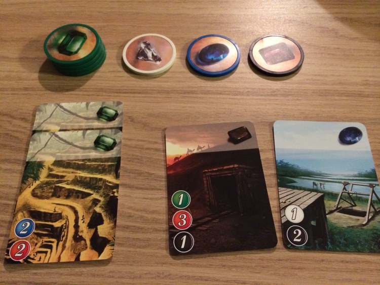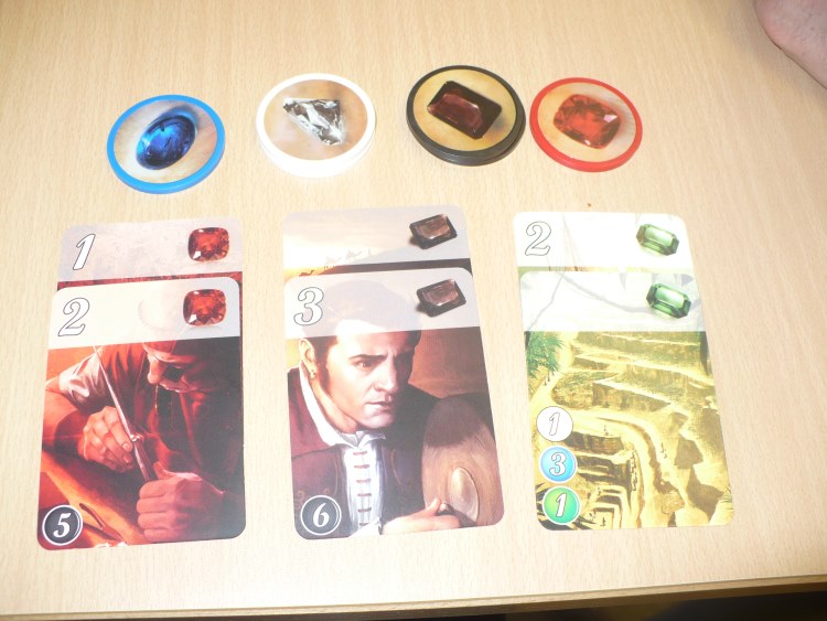Pour leur 1er jeu, les Space Cowboys ont misé sur un matériel parfaitement illustré par Pascal Quidault ! Le bonhomme a un sacré coup de crayon et, personnellement, c’est avec un très grand intérêt que je scruterai ses prochaines productions. La boite renferme donc 40 jetons représentant des pierres précieuses, 90 cartes développement et 10 tuiles nobles. Rien d’autre… hormis les règles évidemment ! D’ailleurs, parlons-en. Elles tiennent sur 2 pages et demi, mise en place incluse ! On est donc à des années lumières du jeu avec 15 kilos de matériel et règles aussi épaisse qu’un bottin.