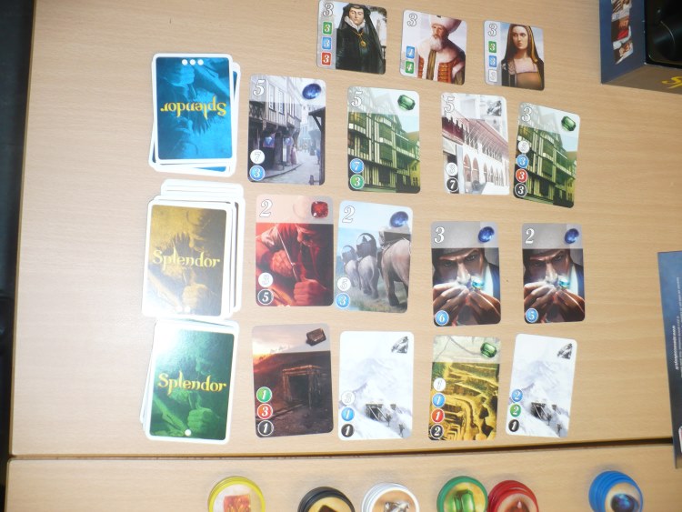 S’il y a un jeu que j’attendais tout particulièrement cette année, c’était bien Splendor. En effet, il s’agit, ni plus, ni moins que du tout 1er jeu édité par les Space Cowboys. Si ce nom ne vous dit rien (vraiment !?), sachez qu’il s’agit d’une toute nouvelle maison d’édition ludique qui a pour particularité d’être composée de ténors du jeu de société moderne ! Pensez donc, Marc Nunes et Philippe Mouret (deux ex-têtes pensantes d’Asmodée), Croc (un monument du jeu de rôle et auteur notamment de Claustrophobia), Cyril Demaegd (Le Boss d’Ystari Games et auteur notamment d’Amytis) et enfin Sébastien Pauchon (co-fondateur de GameWorks et auteur notamment d’Yspahan). Bref, avec une équipe pareil, on ne peut que s’attendre à du lourd… du très lourd même! Le genre de jeu qui n’a pas froid aux yeux. Avec des règles longues comme le bras, des cubes en bois à foisons dans un univers améritrash à base de parties ne pouvant durer moins de 4 heures tellement, c’est bon…