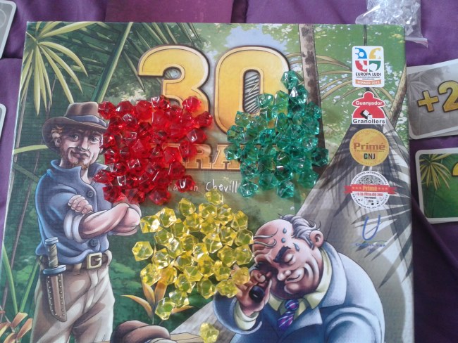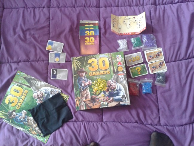 Dans « 30 Carats » les joueurs incarnent des aventuriers venues troquer les pierres précieuses. Le but du jeu est bien évidement de récupérer le plus de Pierres Précieuses de forte valeur et de se débarrasser des autres afin d’être le plus riche en fin de partie.