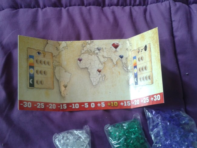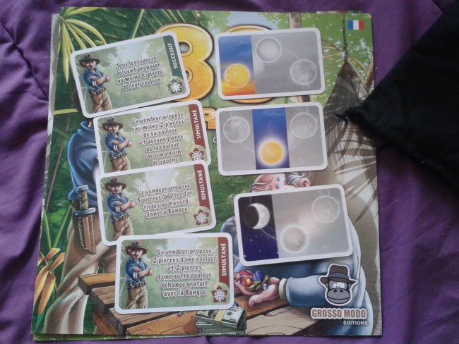Et c’est tout ? Et bien Oui. Les règles sont simples… très simples même ! Mais bien évidement, cette mécanique très accessible cache une véritable machine de guerre en matière de déduction de valeur et de bluff. C’est que, bien évidemment, il va falloir la jouer fine pour gagner. Débarrassez-vous massivement d’une couleur et personne ne vous suivra. De même, rester protectionniste sur une couleur précise attirera automatiquement l’attention. Il faut donc être subtile afin de ne pas attirer les soupçons et de tenter d’estimer la vraie valeur des pierres que vous récupérez. Vaste chantier !