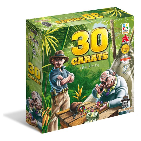 « 30 Carats » est un jeu de troc concocté par Fabien Chevillon et illustré par Tony Rochon. Avant de finir sur les étals de votre boutiquier préféré, sachez que le prototype du jeu, intitulé « Les diamantaires » a eu une belle carrière. En effet, les récompenses se sont accumulées et figurent, à très juste titre, sur la boite de la version commerciale du jeu éditée par Grosso Modo Editions : Prix EuropaLudi Winner 2012, Primé au concours du CNJ de Boulogne Billancourt, Guanyardor Granollers, Charvin d’Or 2011 et enfin primé au Concours international de créateur de jeu de société Poly Games 2013 ! Bref, un palmarès à faire pleurer d’envie bien des créateurs (pros ou amateurs) de jeu de société. Mais quelle est donc cette curiosité ludique qui semble avoir conquis tous les jurys croisés sur son parcours ?