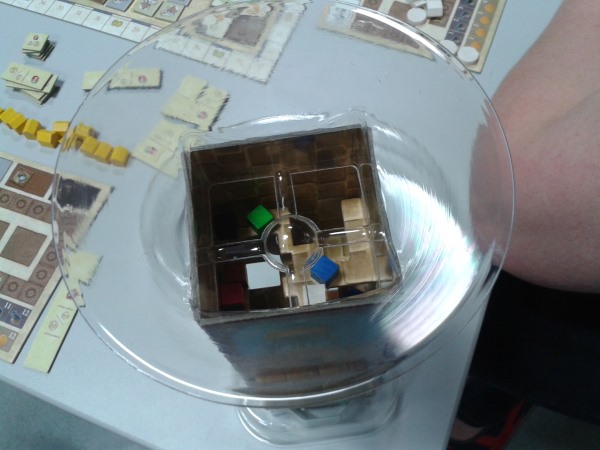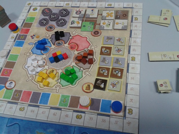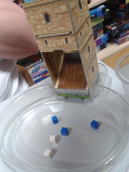 Evidemment, une fois le matériel en place, c’est bien la tour de cubes qui intrigue le plus les joueurs. Il faut dire que la dernière fois que l’on croisé un tel « instrument ludique » c’était pour Shogun, un War Game également édité chez Queen Games. La tour servant alors à simuler les combats… La grande idée de Stefan Feld est d’avoir repris cette mécanique pour l’utiliser dans un tout autre but : ici, cet accessoire permet de définir les actions possibles des joueurs. Une idée à priori simple mais diablement bien exploitée.