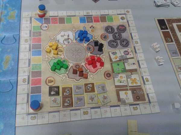 La 1ère chose qui surprend lorsque l’on a en face de soit une boite d’Amerigo, c’est sa taille : 2 fois plus grande que celle de Puerto Rico ! Et au niveau du poids, c’est un peu la même chose. Bref, prévoyez un caddy vide si vous comptez vous procurer la boite chez votre revendeur habituel ! 😉 Une fois celle-ci ouverte, on constate que le matériel est vraiment conséquent. Sans entrer dans les détails, sachez que chaque joueur a son propre plateau individuel et qu’un grand plateau modulable permettant de créer une aire de jeu différente à chaque partie est placée au centre de la table. De plus, des jetons représentant toutes sortes d’épices sont également présents, ainsi que des petits bateaux et des comptoirs en bois et, surtout, on découvre avec envie une tour de cubes ! Cette dernière explique d’ailleurs en partie la taille hors norme de la boite. Une fois tout le matériel dépunché, il vous faudra un bon moment pour tout mettre en place (surtout lors de votre 1ère partie). Il est essentiel de lire avec une grande attention la mise en place du plateau afin de ne pas boguer le jeu (les bateaux devant toujours pouvoir faire le tour d’une île, qu’importe sa taille).