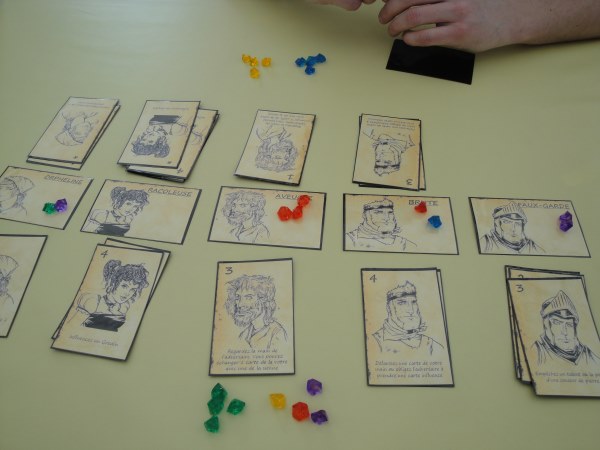 - Larcins & Gredins (Jean-Denis Oste) : un jeu simple mais terriblement efficace. Des personnages sont posés au centre de la table, ces personnages possèdent des perles qu’il va falloir obtenir pour gagner (5 perles d’une couleur, 4 perles de 2 couleurs, 3 perles de 3 couleurs…). Pour ça, vous allez devoir piocher des cartes personnages (les mêmes personnages que ceux posés au centre) mais ces cartes sont numérotées (joker & 1 à 4). En posant une carte devant un personnage (avec condition), vous prenez une perle et si vous avez la carte qui comportent le chiffre le plus élevé (par rapport à ce qu’a posé votre adversaire sur le même personnage), vous pouvez utiliser le pouvoir du personnage. C’est simple comme ça mais c’est pas si facile croyez moi.