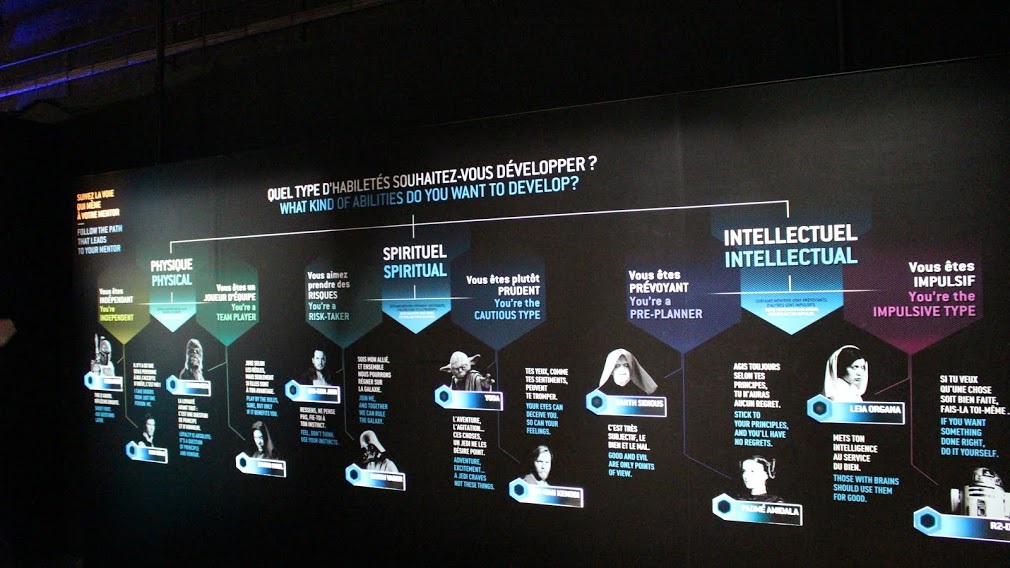 L’autre accessoire, c’est le bracelet. Celui-ci vous accompagnera de salles en salles. Il faudra le mettre en contact avec des bornes vous posant des questions précises sur le personnage de Star Wars que vous pourriez être. Quelle race ? Quelle éducation ? Quelles caractéristiques de personnalité ? etc. 10 questions au total qui parsèment l’exposition et qui vous permettront, au final de créer un véritable personnage tout droit sortie de l’univers de Mister Lucas. Mieux, il sera même possible de recevoir un lien internet sur votre boite mail afin de récupérer les informations sur l’avatar que vous avez conçu au fur et à mesure de l’exposition ! Une idée vraiment agréable.