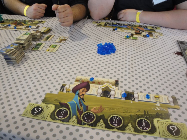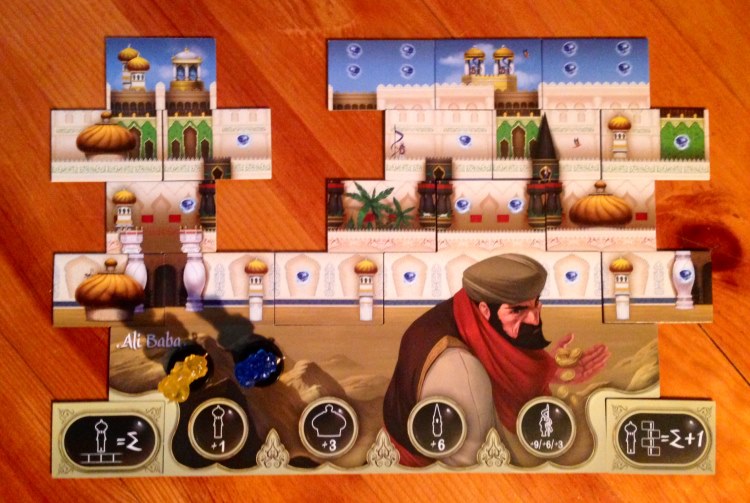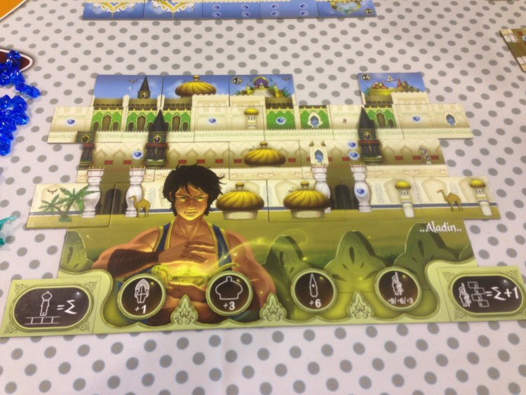 Le décompte de points se fait par les caractéristiques de votre personnage et les éléments de votre construction. Certains vont marquer des points sur les tourelles alors que d’autres vont se battre pour les minarets. Vous allez être tranquilles pour les tuiles « palmiers » alors que vous allez devoir user de malice voir de génie pour récupérer les ornements de portes… on commence à voir ici, l’utilité des génies pour jouer deux fois, aller chercher la tuile qu’il vous faut, la choix de dévoiler une deux ou trois tuiles : j’ai un plus grand choix, mais j’en offre plus aux autres également… et donc voici le coté taquin glissé dans ce jeu par M. Chevallier. Se rajoute à ça, les deux tuiles « objectifs secrets » qui en plus de donner les bornes de votre palais, permettent de rajouter des points sans que les adversaires le soupçonne…