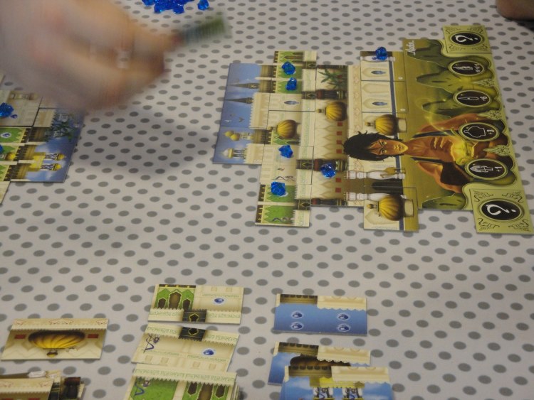 • L’action de construction est la principale action du jeu. Vous avez à disposition quatre niveaux de tuiles. Le premier étage est marqué d’une ligne bleue. Le second par des pointillés rouges. Le troisième possède des arabesques vertes. Et le dernier, le ciel. Sur ces tuiles figurent des motifs (élément de portes, des dômes, des gardes…). Ces éléments vont vous faire marquer des points en fonction du votre personnage. Vous allez alors choisir une colonne, et vous allez ouvrir jusqu’à trois tuiles de cette colonne. Ensuite, il faut prendre judicieusement une tuile en fonction des motifs représentés dessus. Bien sûr il y a des règles de pose. Construire en boutisse, en quinconce. Toujours poser la tuile sur le bon niveau. Les motifs doivent être continus (formations d’une porte, d’un minaret…). Vous ne pouvez pas faire de trou dans votre construction… Les tuiles sont recto-verso (même illustrations représentées mais en symétriques, ça aide à la construction). Il faut également respecter les limites de votre palais, données par les tuiles « objectifs secrets ». Nous y reviendrons un peu plus tard.